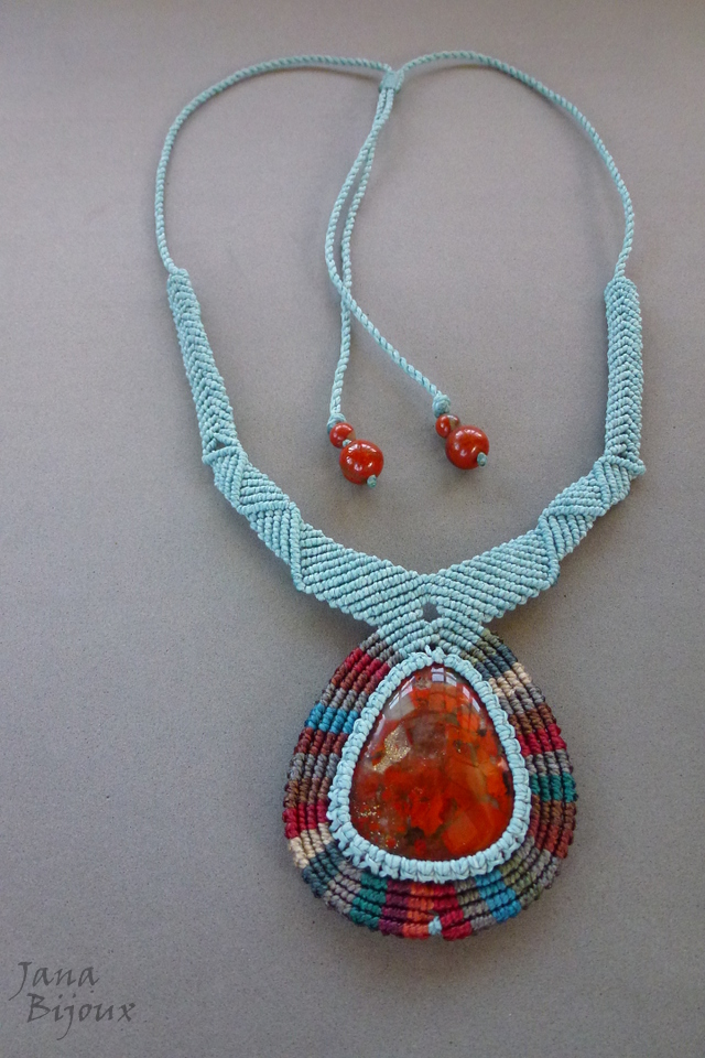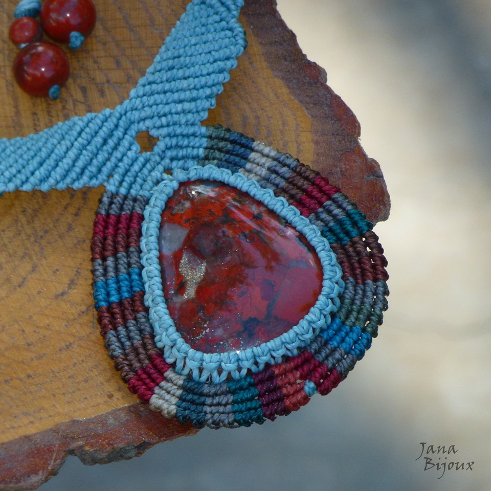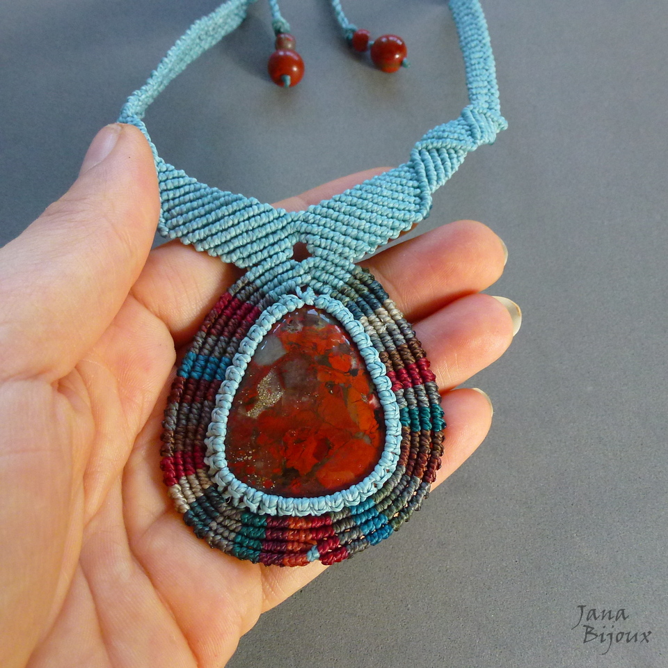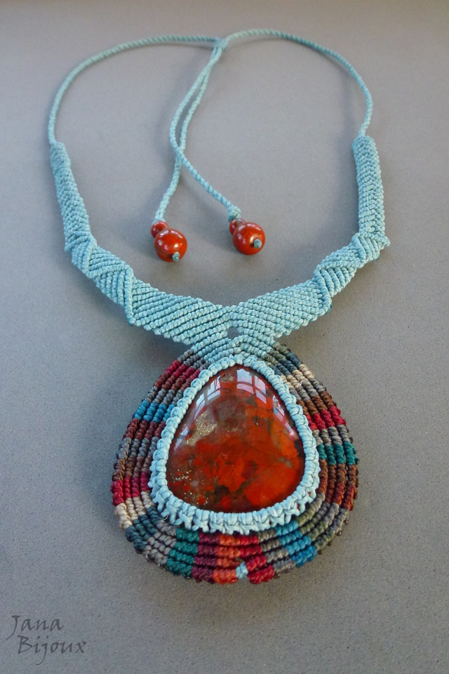 Náhrdelník s jaspisem dělán makramé technikou, bez lepidel, bez vrtání, kámen drží dokonale v náhrdelníku jen za pomocí uzlů. Na krku perfektně sedí, je celý dělán bez nastavování nití a dokonale zpracován.