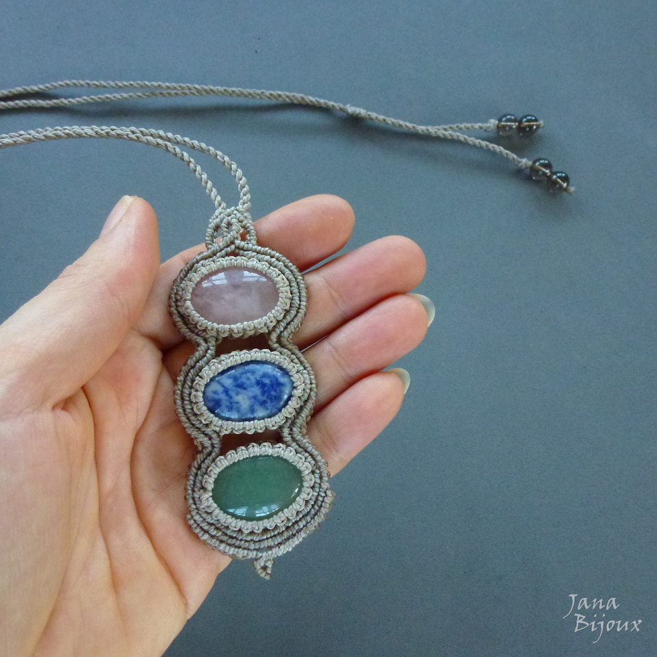 3 pedras naturais, de alta qualidade – sodalita- granito , aventurina e quartzo rosa. As pedras seguram junto só com macramé, sem cola e sem furos e juntas medem 8 cm de altura e 3,6 cm de largura. Todas tem polimento cabochon (= pedra preciosa polida sem arestas, em formato circular. Plana de uma lado e arredondada de outro).