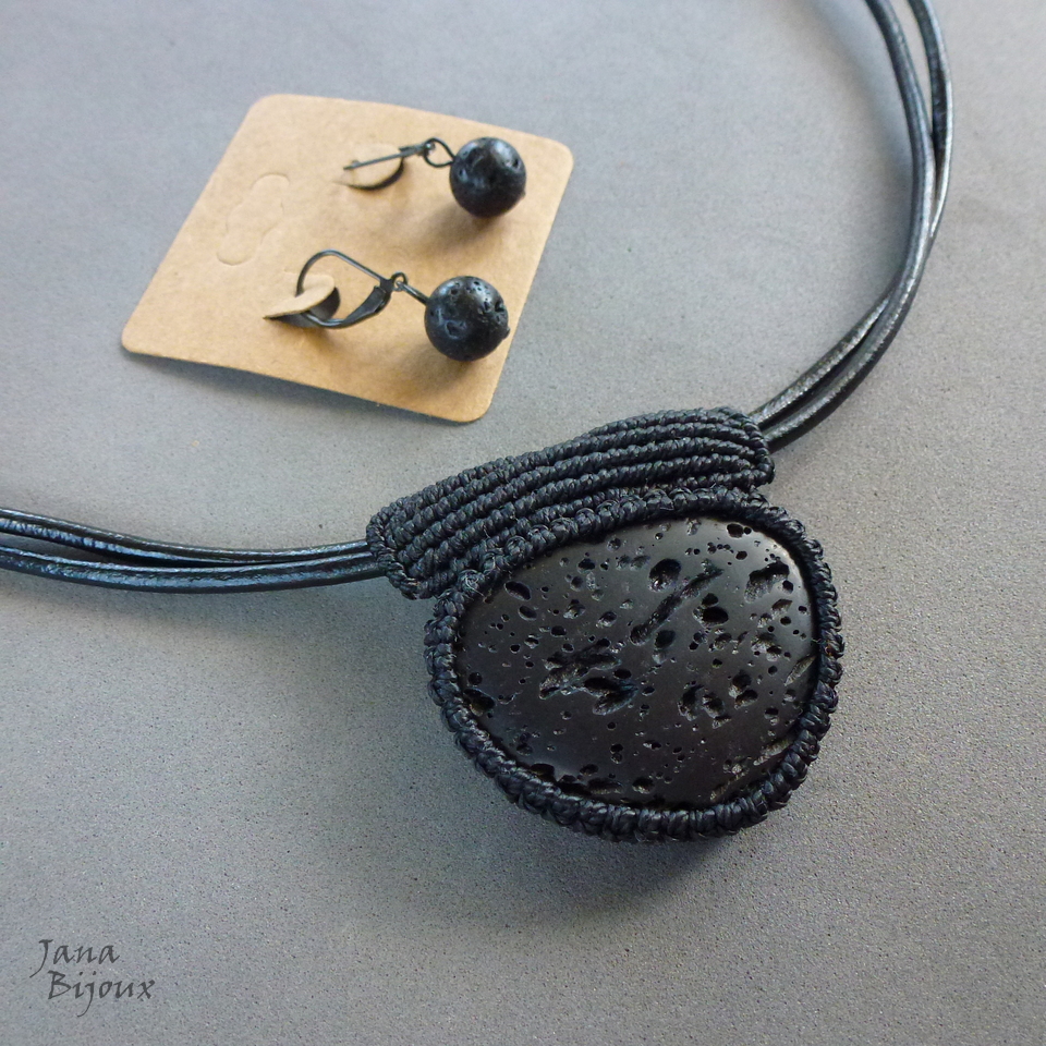 Colar unissex, que chama bastante atenção, feito com pedra de vulcão, macramé e couro duplo preto. A pedra tem formato triangular, mede 3,4 cm por 4,1 cm e tem alça feita de macramé, bem trabalhosa. Acabamento em ouro velho, formato T, comprimento 56,5 cm.
