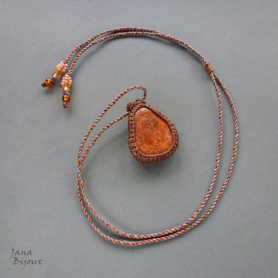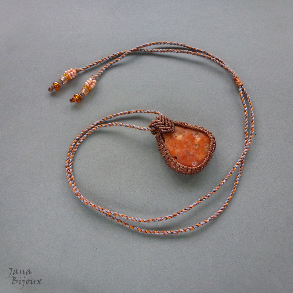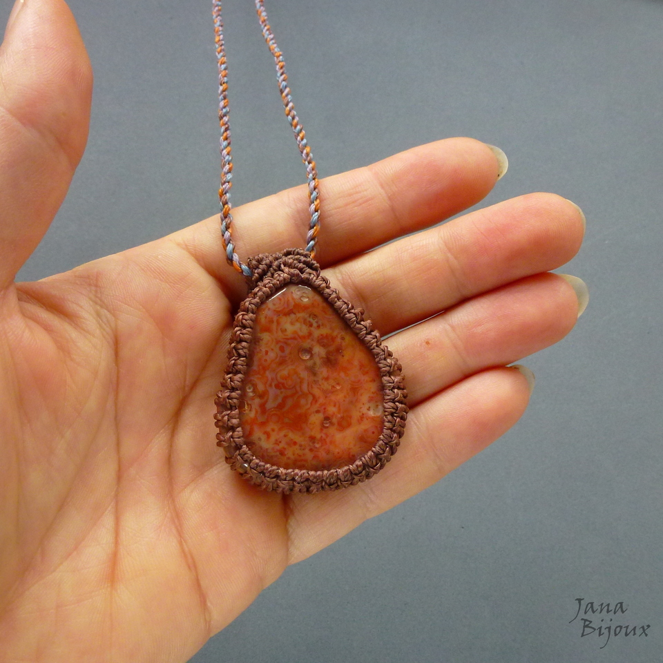 Colar com agata irregular, rústica, num colar de comprimento regulável. A pedra tem 4,3 x 3,6 cm, com macramé em volta o pingente mede 4,8 cm e tem movimento livre no cordão, que é feito de 4 cores diferentes (2 marrons, lilás e ferrugem), deixando colar assim mais interessante, nas pontas miçangas importadas. O colar abre até 90 cm.