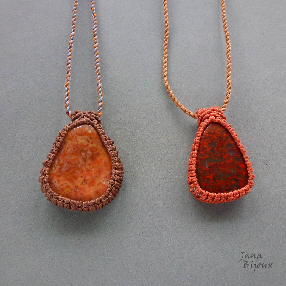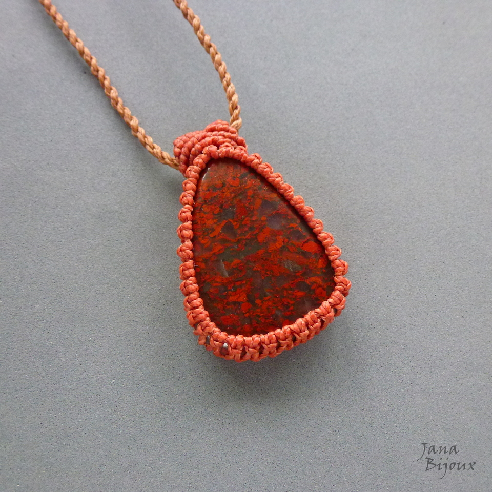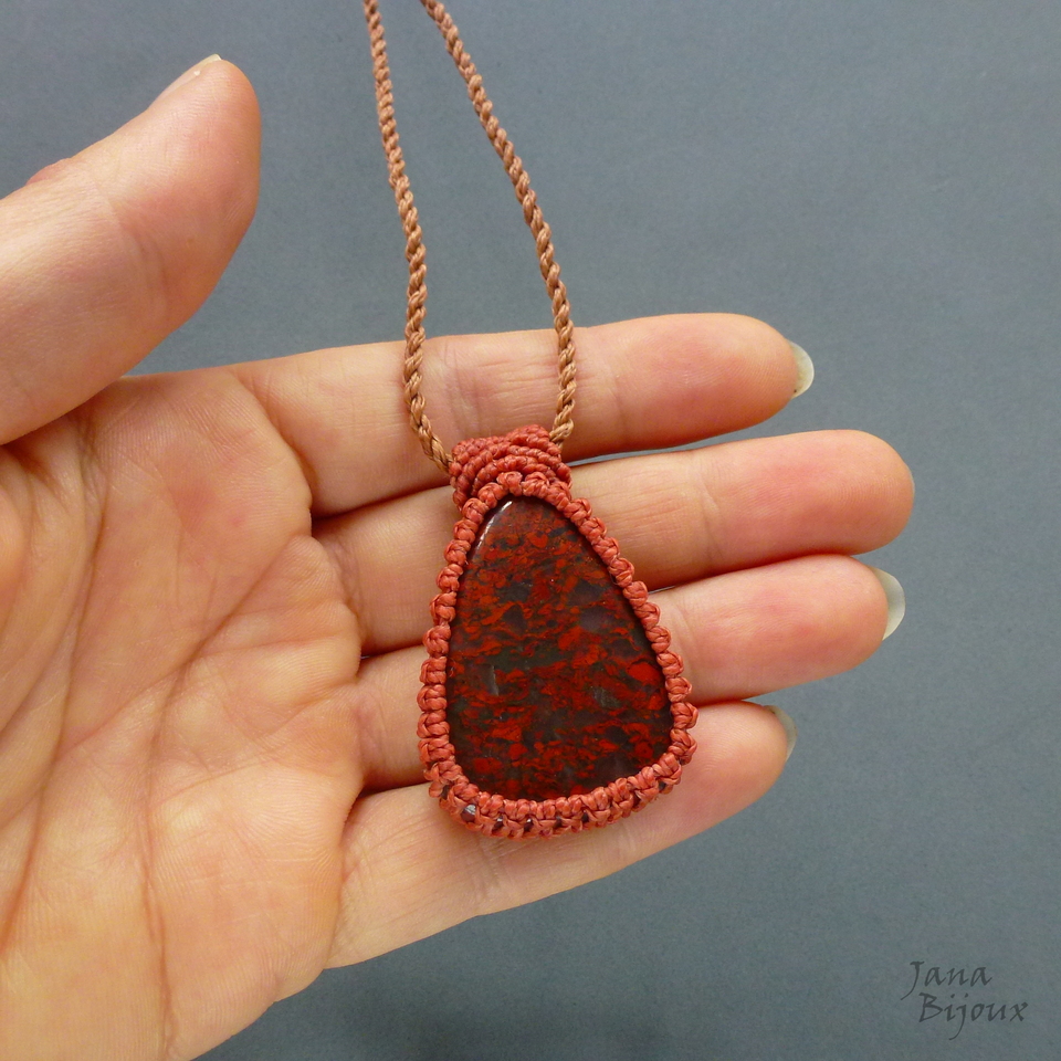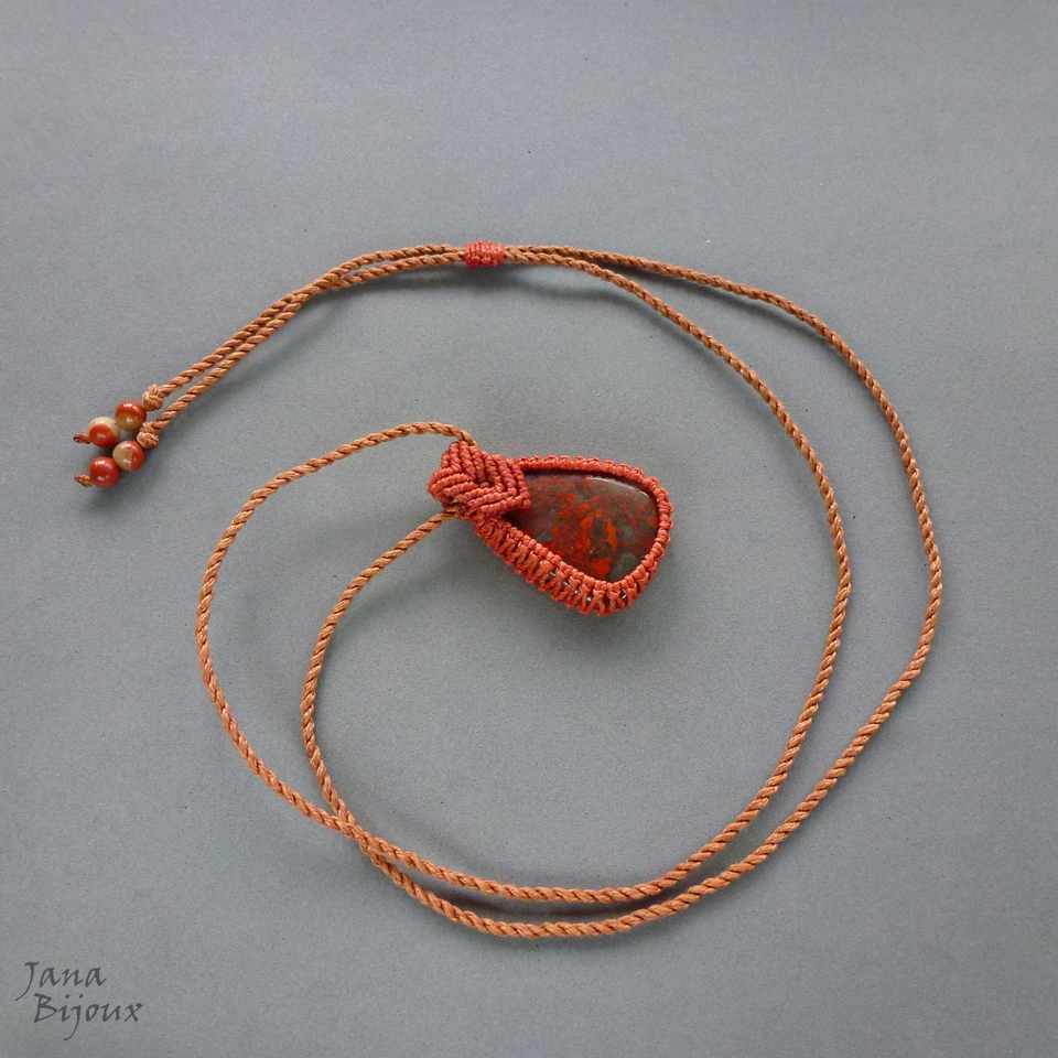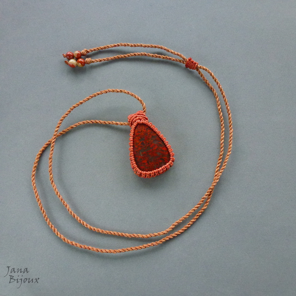 Colar com jaspe num colar de comprimento regulável. A pedra tem 3,9 x 2,8 cm, com macramé em volta o pingente mede 4,6 cm e tem movimento livre no cordão, que é feito de outra cor de fios (marrom claro), deixando colar assim mais interessante, nas pontas 4 bolas de jaspe. Abre até 90 cm.