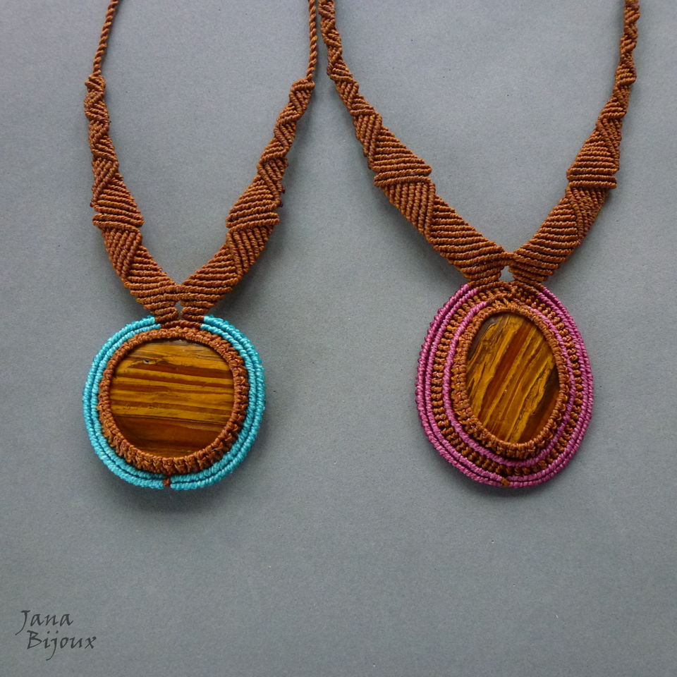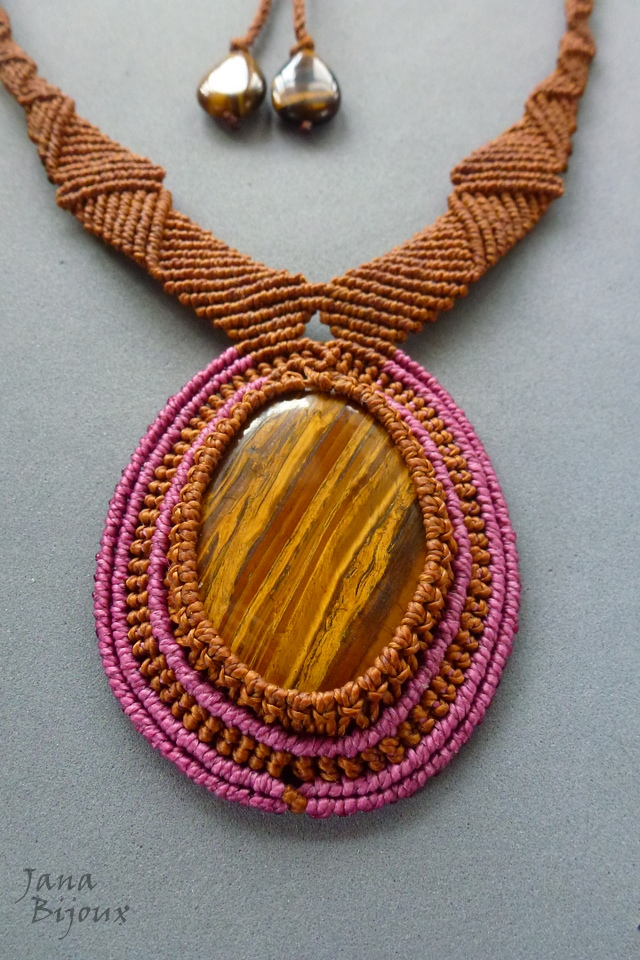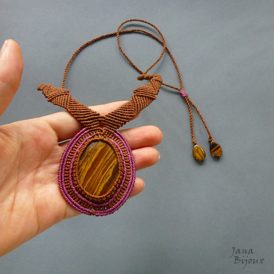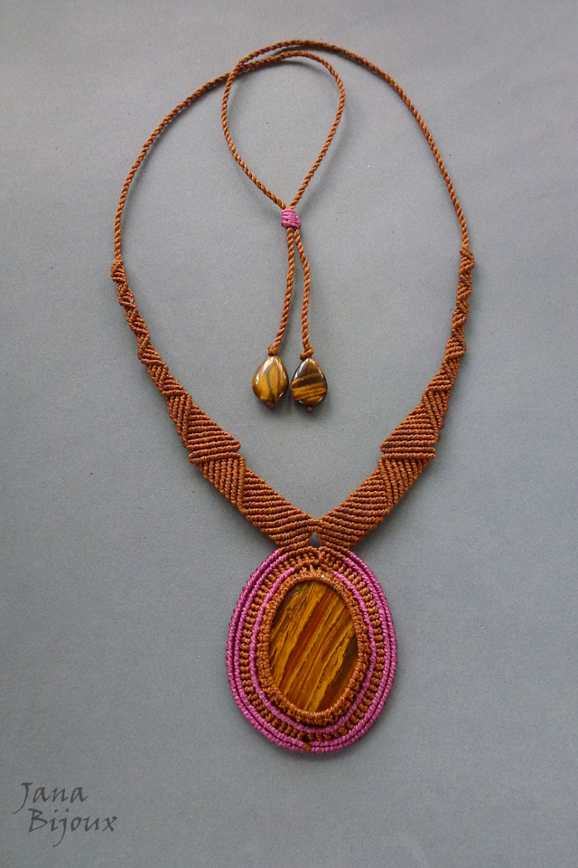 Colar com linda pedra de olho-de-tigre e feito de macramé, sem metal.