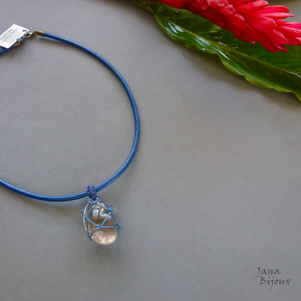 p615 04/12/2018VENDIDOS ( Prodáno)Jana Bijoux Quartzo fumê num couro curto de cor azul e macramé azul. Pedra mede 3,7 x 2,7 cm, com alça tem 5,2 cm. O couro mede 50 cm, acabamento em ouro velho, fecho maior 1,5 cm para look mais luxuoso e manuseio mais fácil R$ R$ 22,00