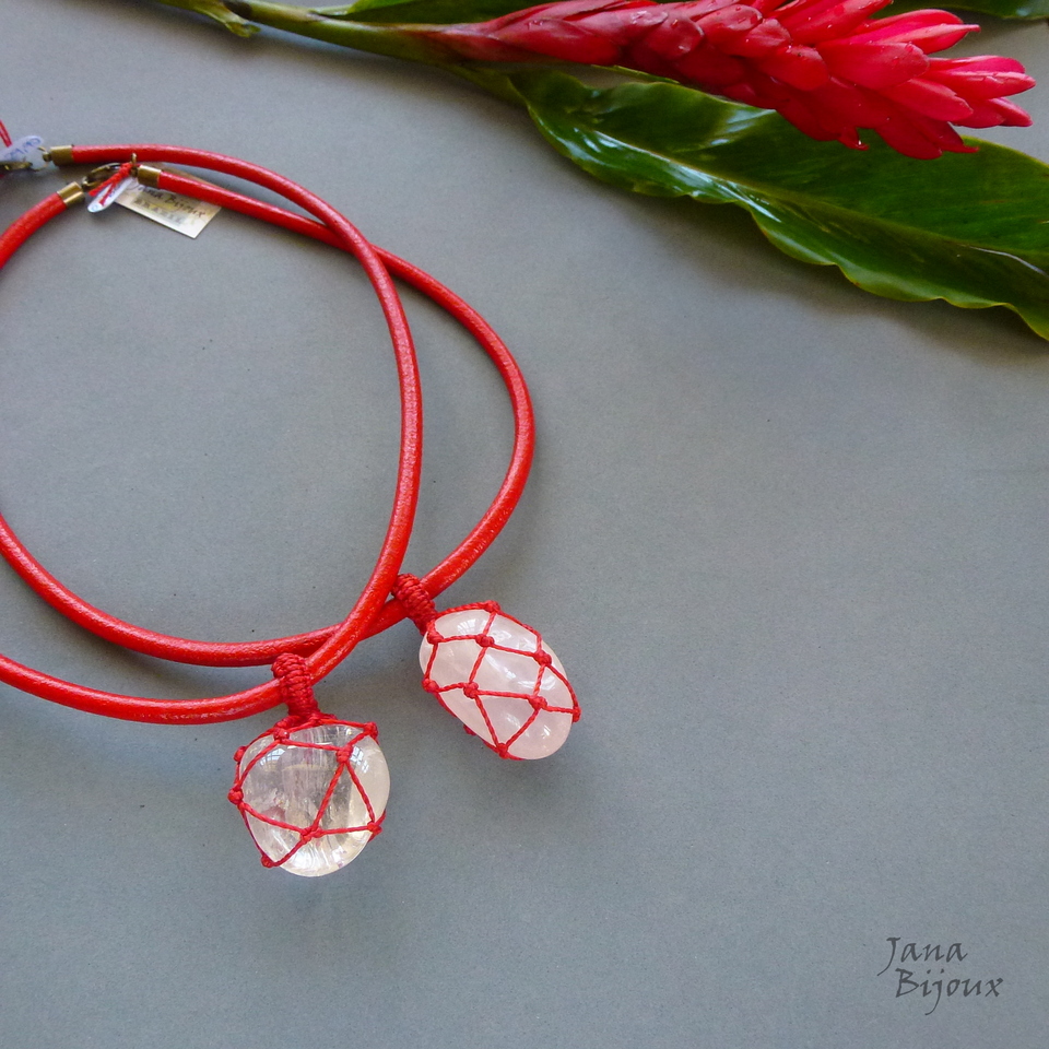 Colar curto vermelho, com quartzo rosa, leitoso