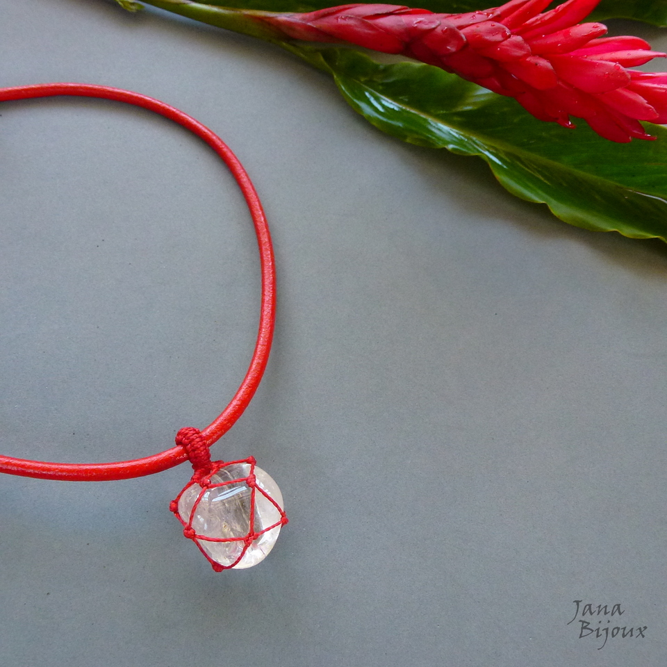 Colar curto vermelho, com lindo quartzo transparente, que iluminará rosto de qualquer um que vai usar