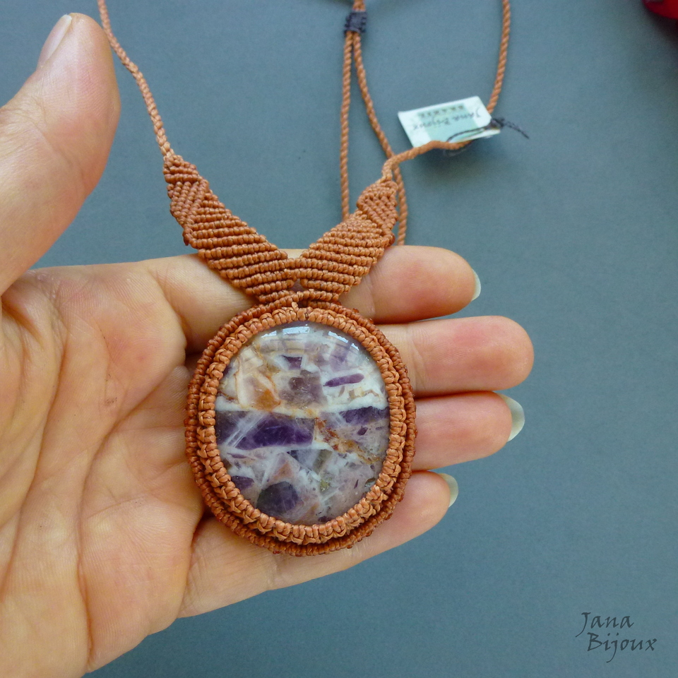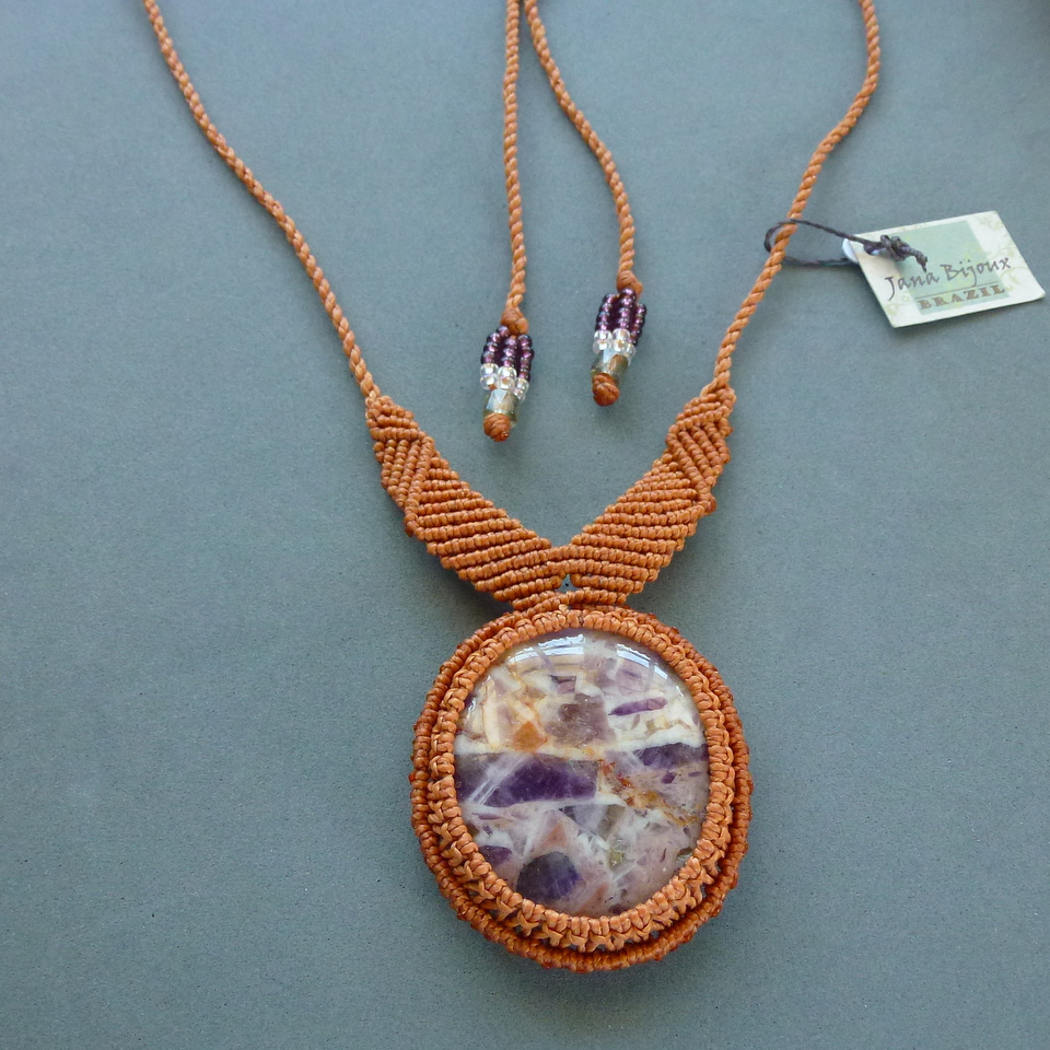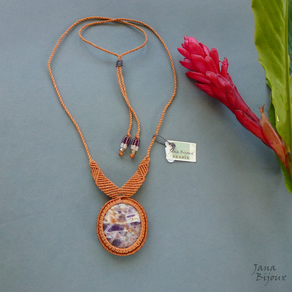 Pedra – ametista, brasileira mede 4,4 cm x 4 cm. Com macramé tem 5 x 4,9 cm. A pedra segura só com nós, s cola e sem furo.