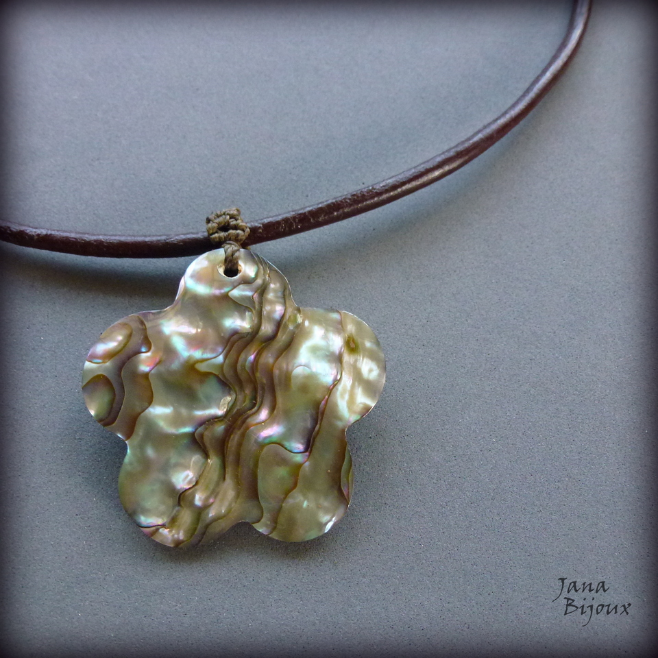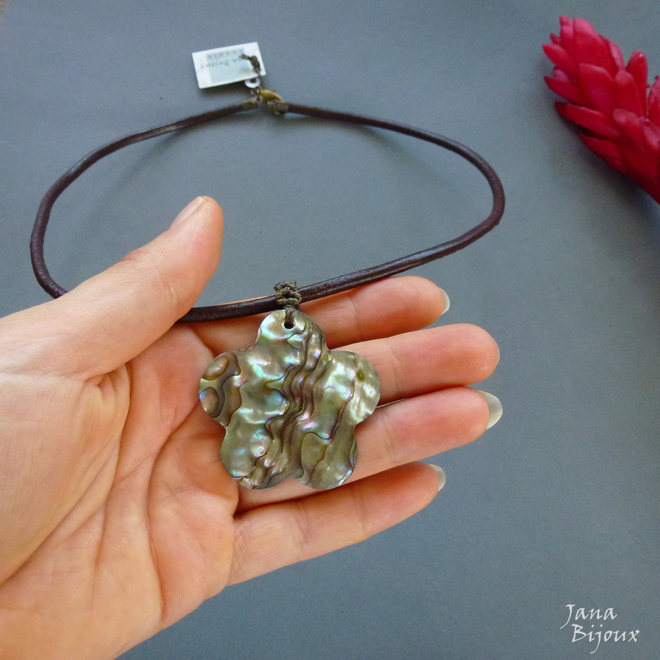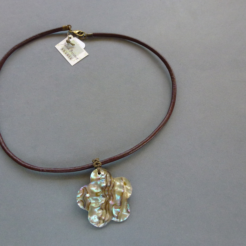 Abalone mede 5 cm, com alça o pingente tem 6 cm e tem movimento livre no couro.  O couro mede 51 cm, tem acabamento em ouro velho, fecho maior 1,5 cm para look mais luxuoso e manuseio mais fácil. R$ 35,00