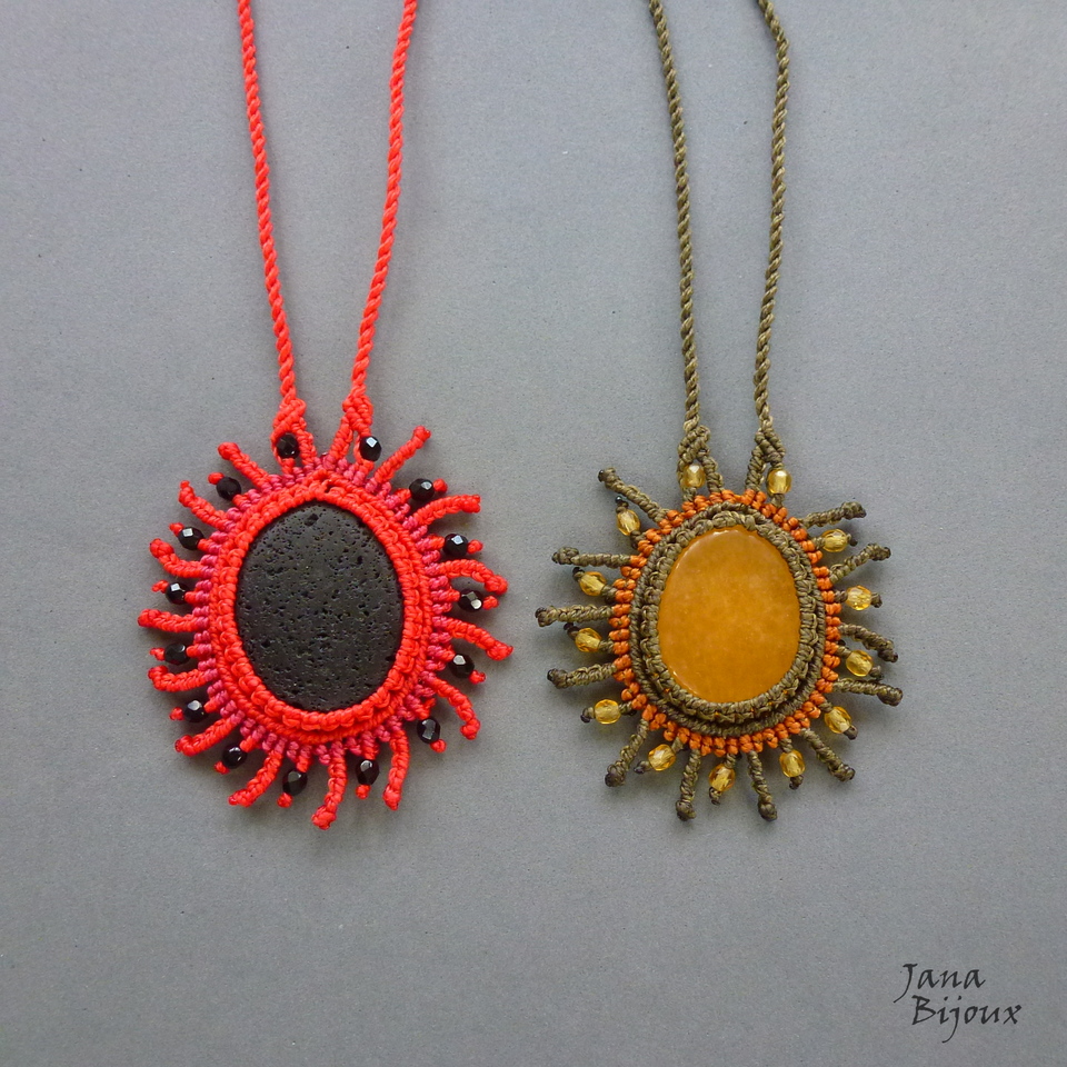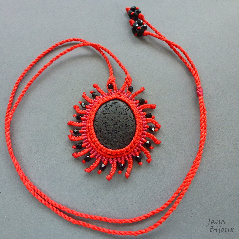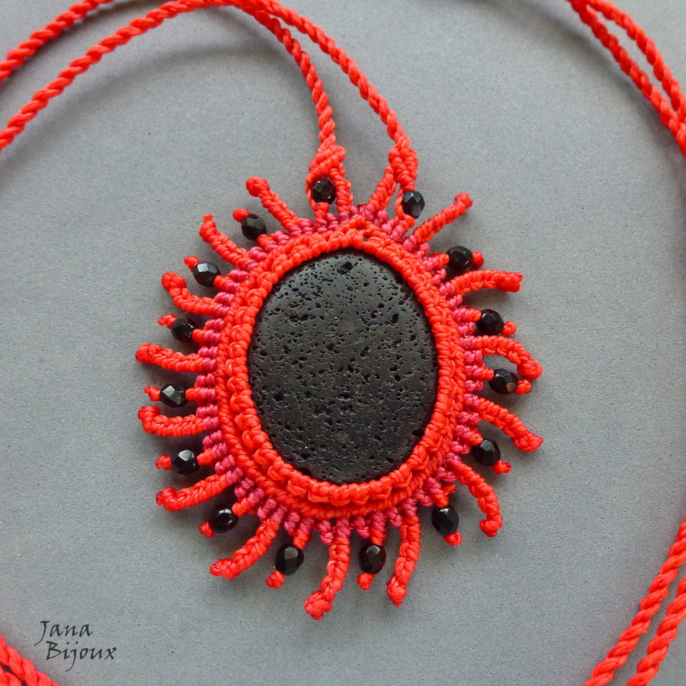 Pedra de vulcão, com fio coral e pink , cristais pretos, num colar de macramé em formato de sol.