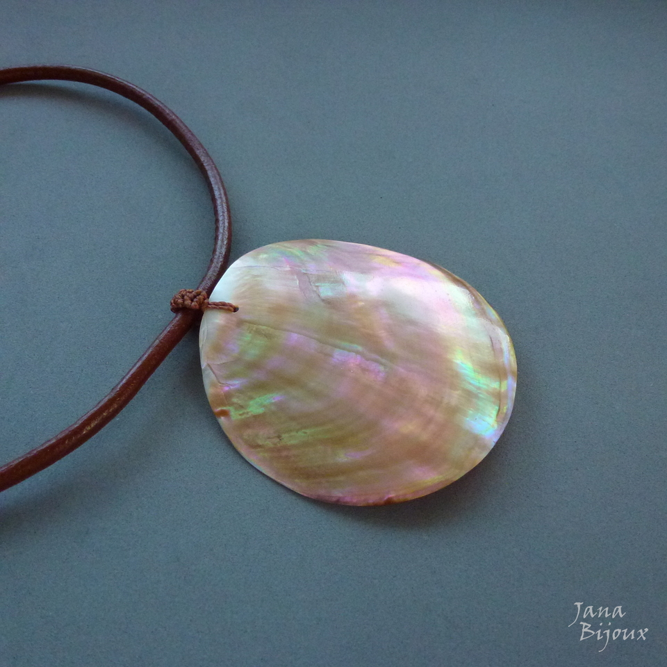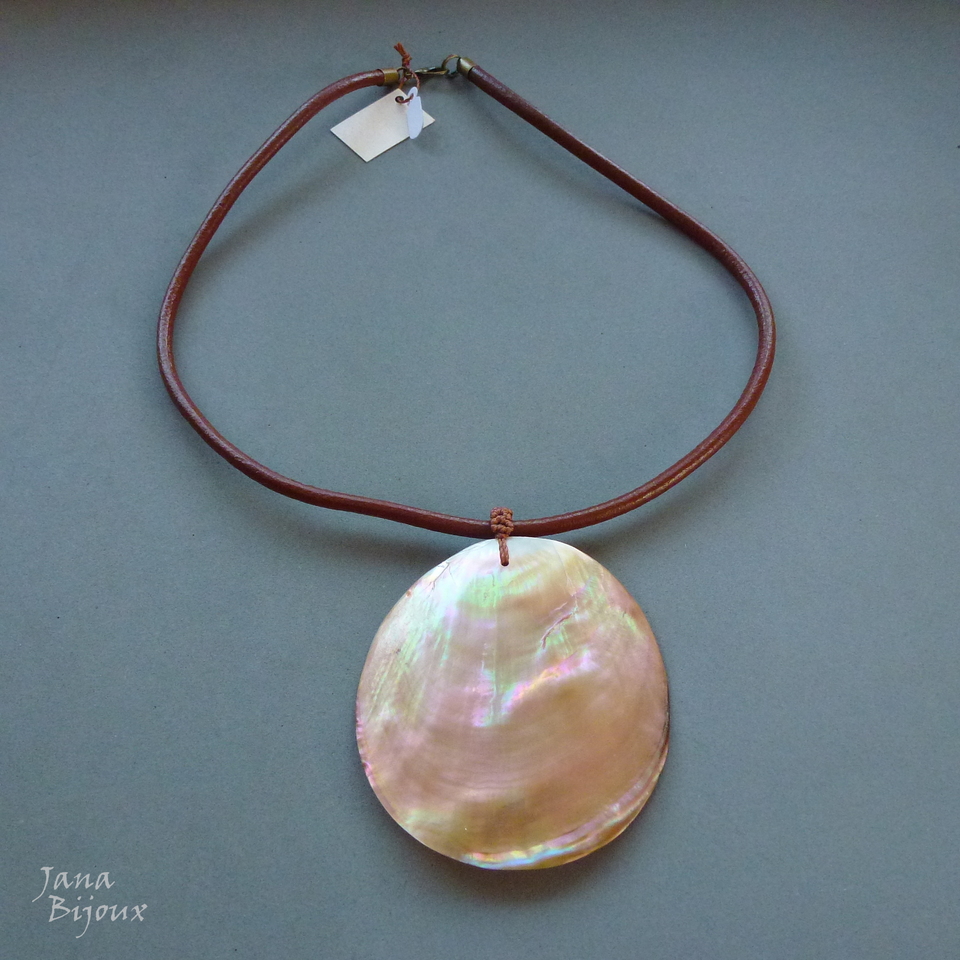 Concha grande, rústica (pequenas trincas, impercebíveis no pescoço) de 8 cm, com linda coloração furta-cor. Alça de macramé e couro grosso, importado. Acabamento em ouro velho, fecho maior 1,5 cm para look mais luxuoso e manuseio mais fácil. Pingente tem livre movimento no couro. R$ 39,00 PEÇA ÚNICA