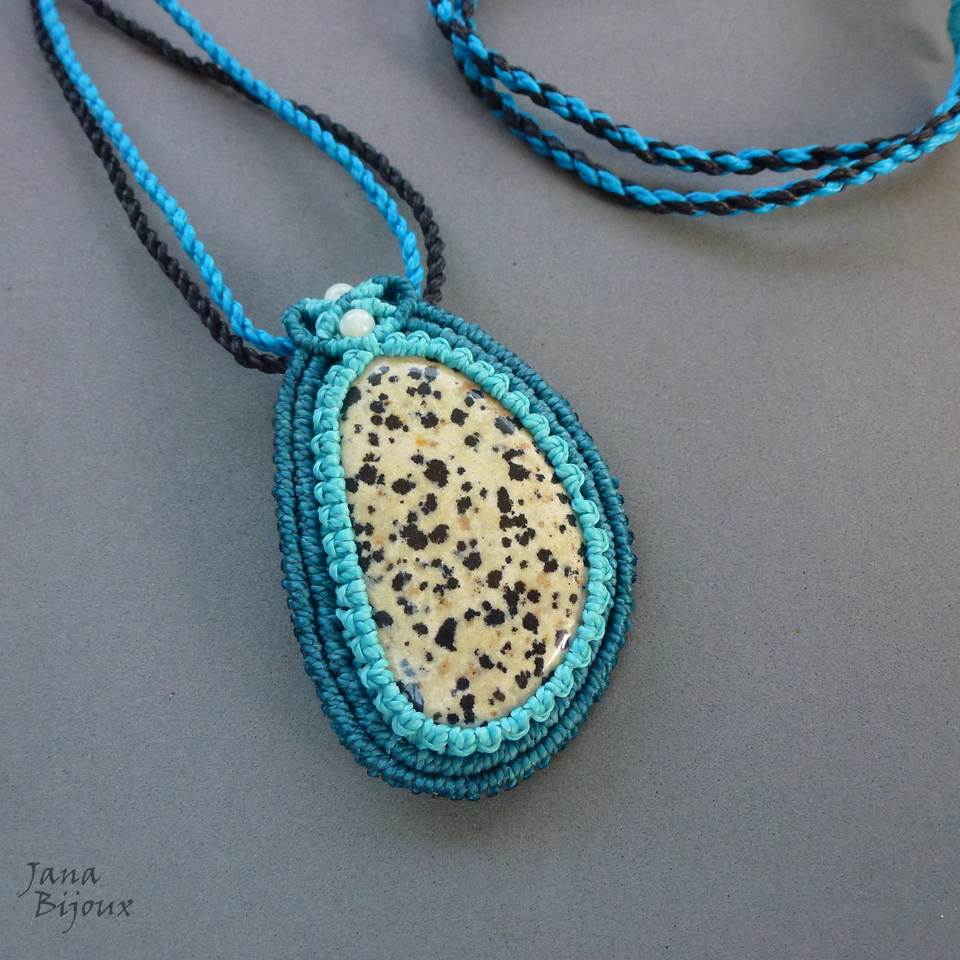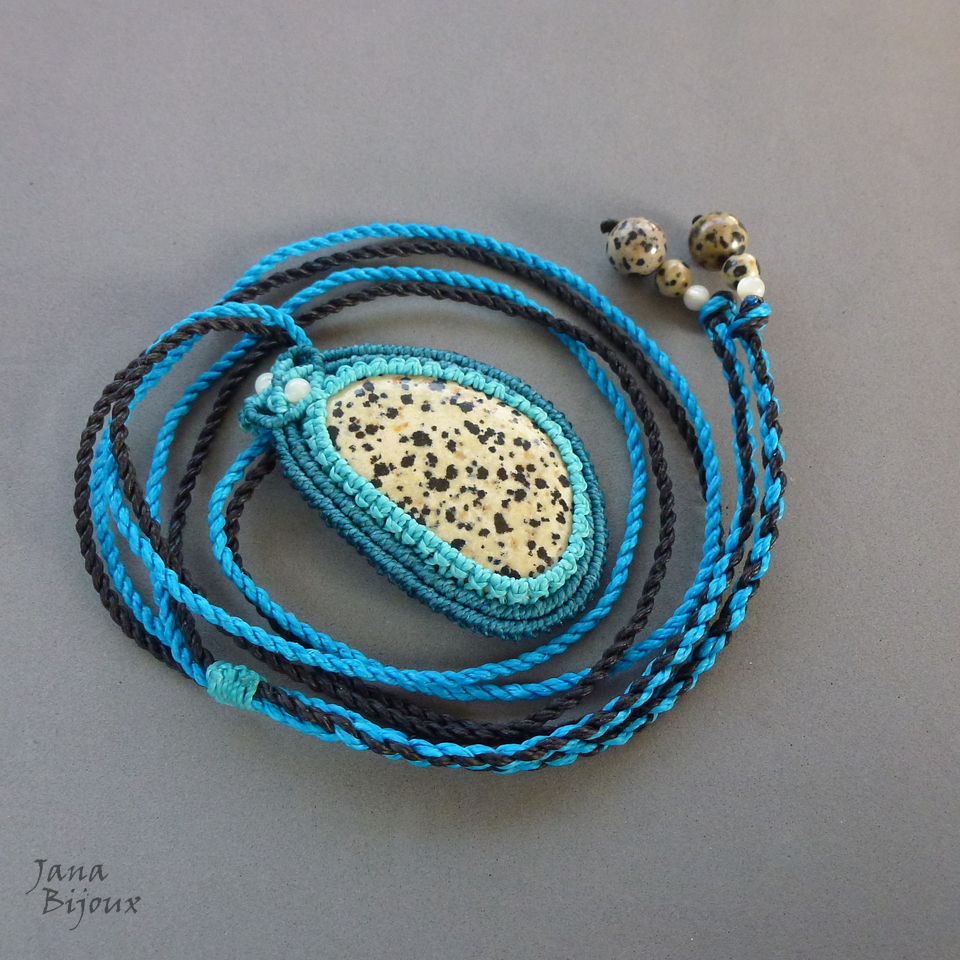 Pedra central mede 48 mm por 30 mm. Com o macramé, ela tem 6,4 cm. A pedra segura só com nós, sem cola e sem furo. Na alça 2 bolinhas de madrepérola.