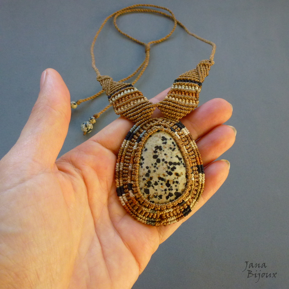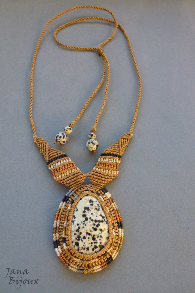 Jaspe dalmata num colar de macramé em tons dourados, crus e preto.