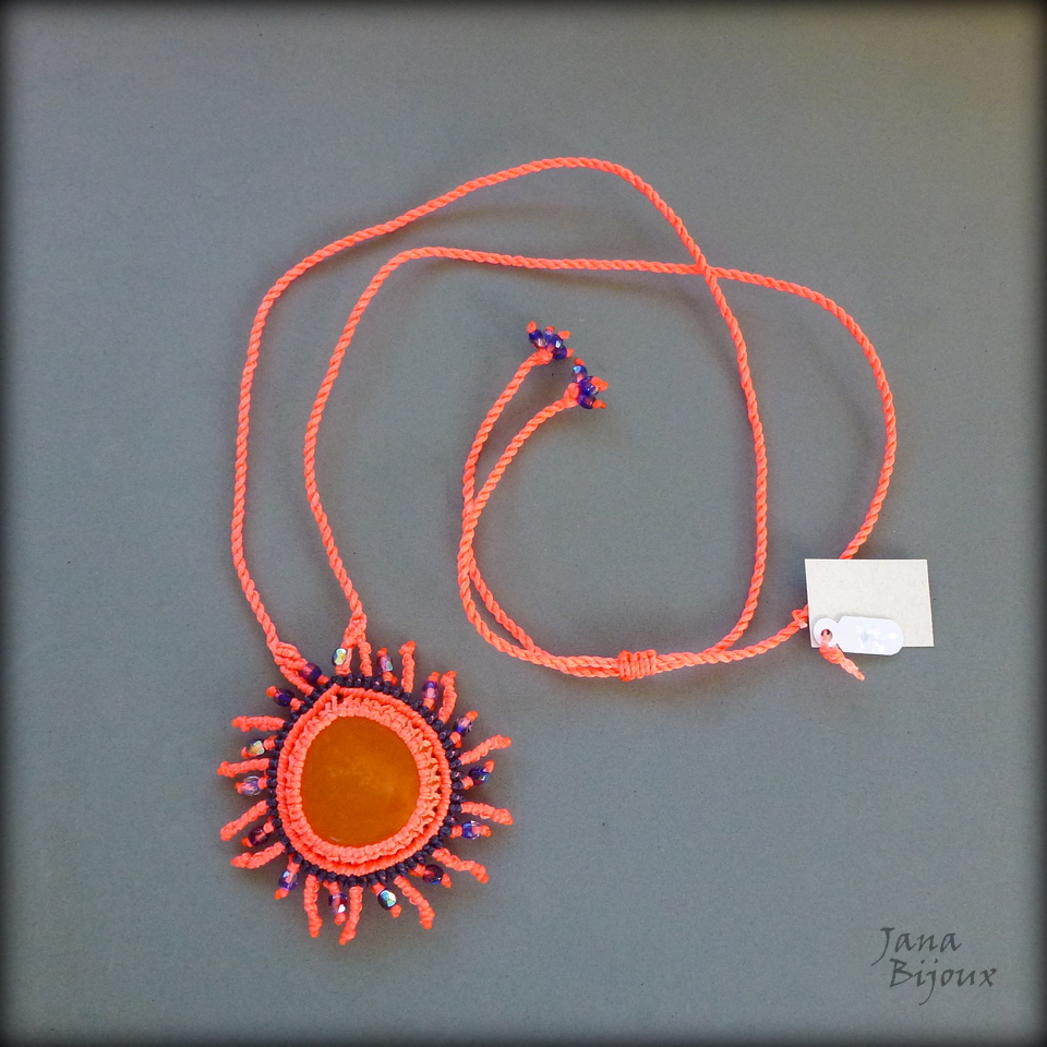 Calcita amarela, com fio coral neon e cristal, num colar de macramé em formato de sol.