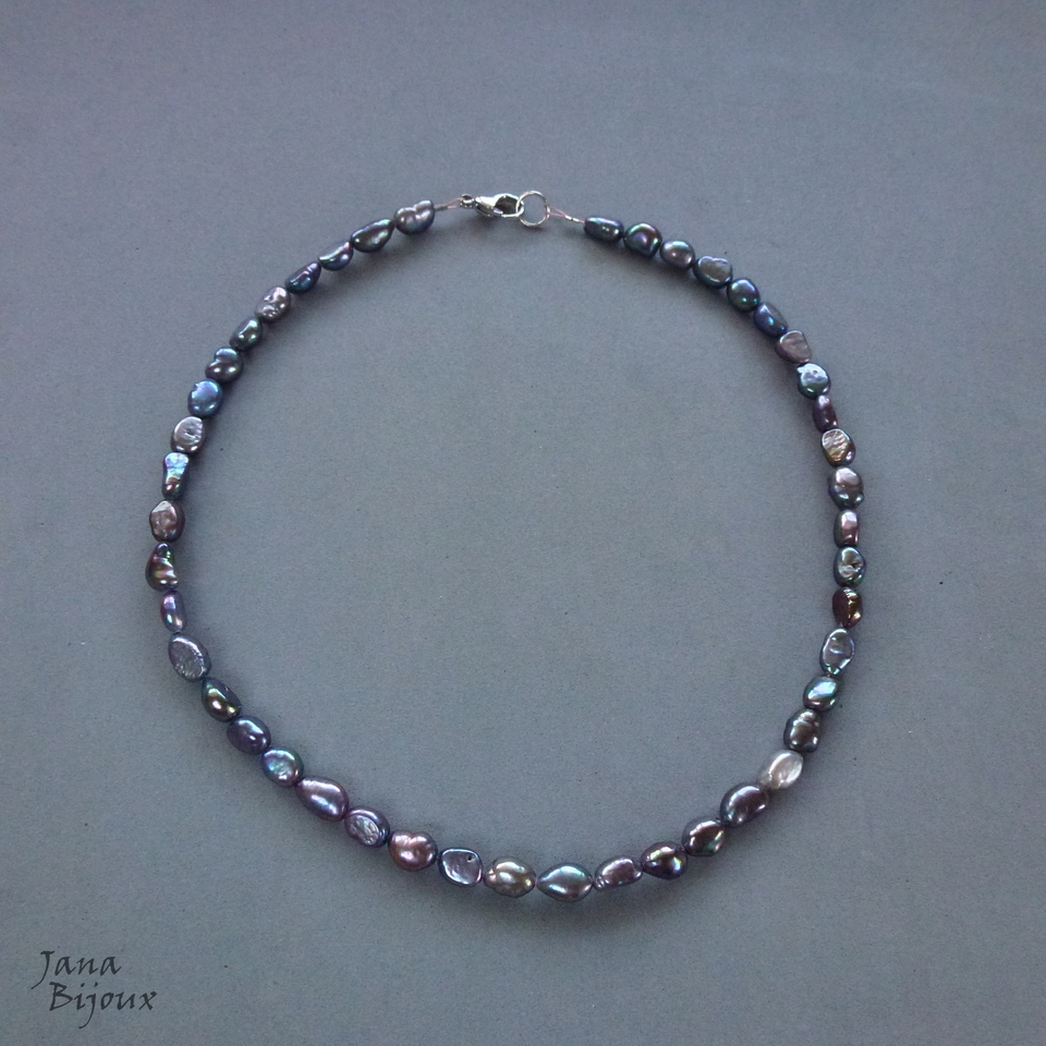 Colar de comprimento 45 cm de lindas pérolas escuras, matalizadas de água doce, meio furta-cor, componentes de aço inox. R$ 46,00