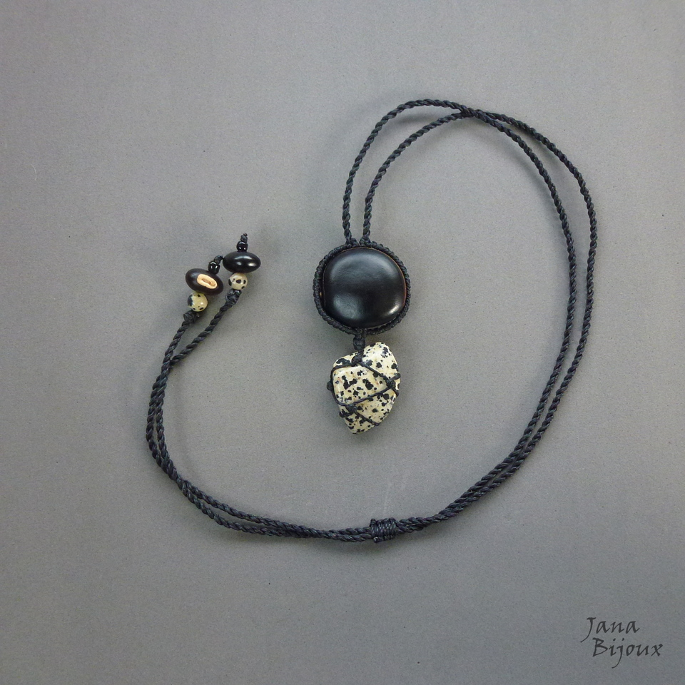 Délka je libovolně nastavitelná, může být nošen jako krátký, střední, či dlouhý, max. délka 85 cm a na každém konci 1 semínko velmi pěkné mucuny – v angličtině se ji říká black velvet bean, pro její samentový černý lesk a 1 kulička leopardího jaspisu.