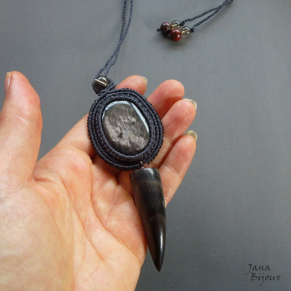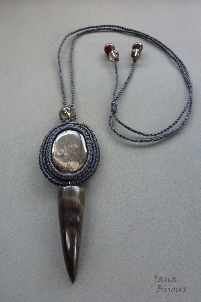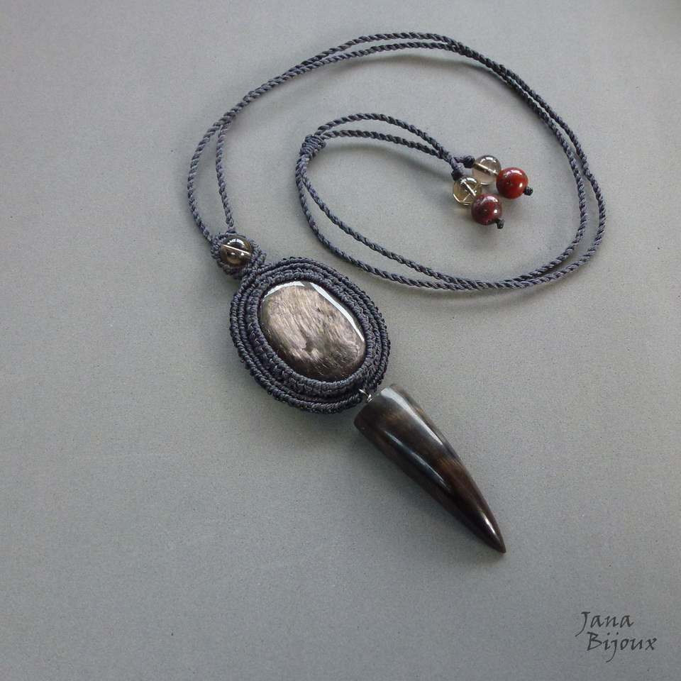 Náhrdelníku s hypestenem, záhnědou, drápem z rohoviny a makramé.