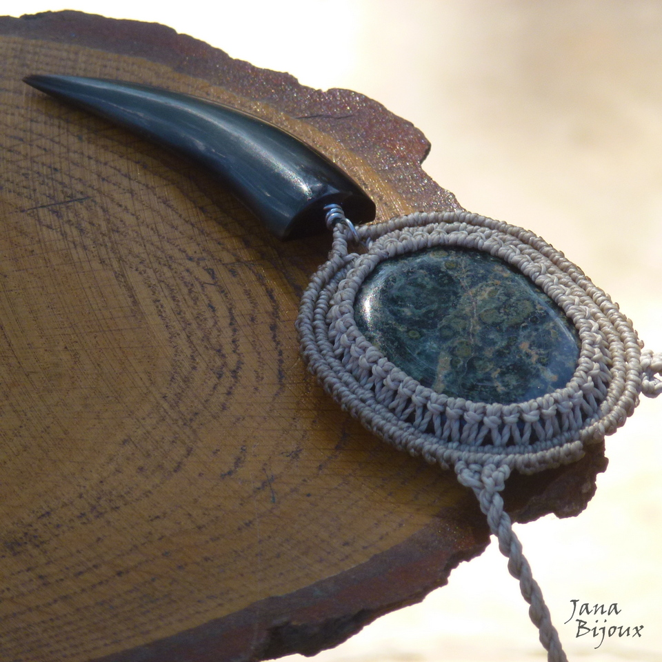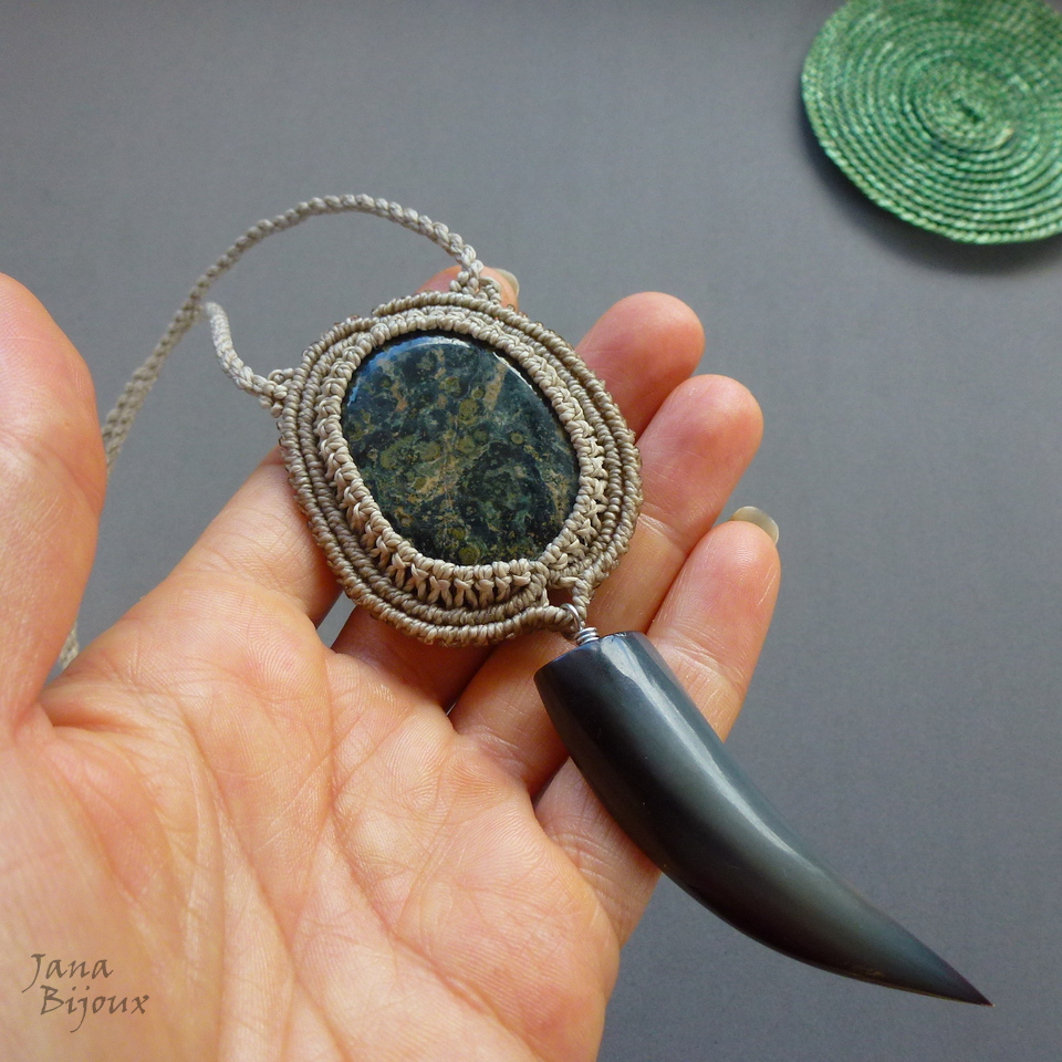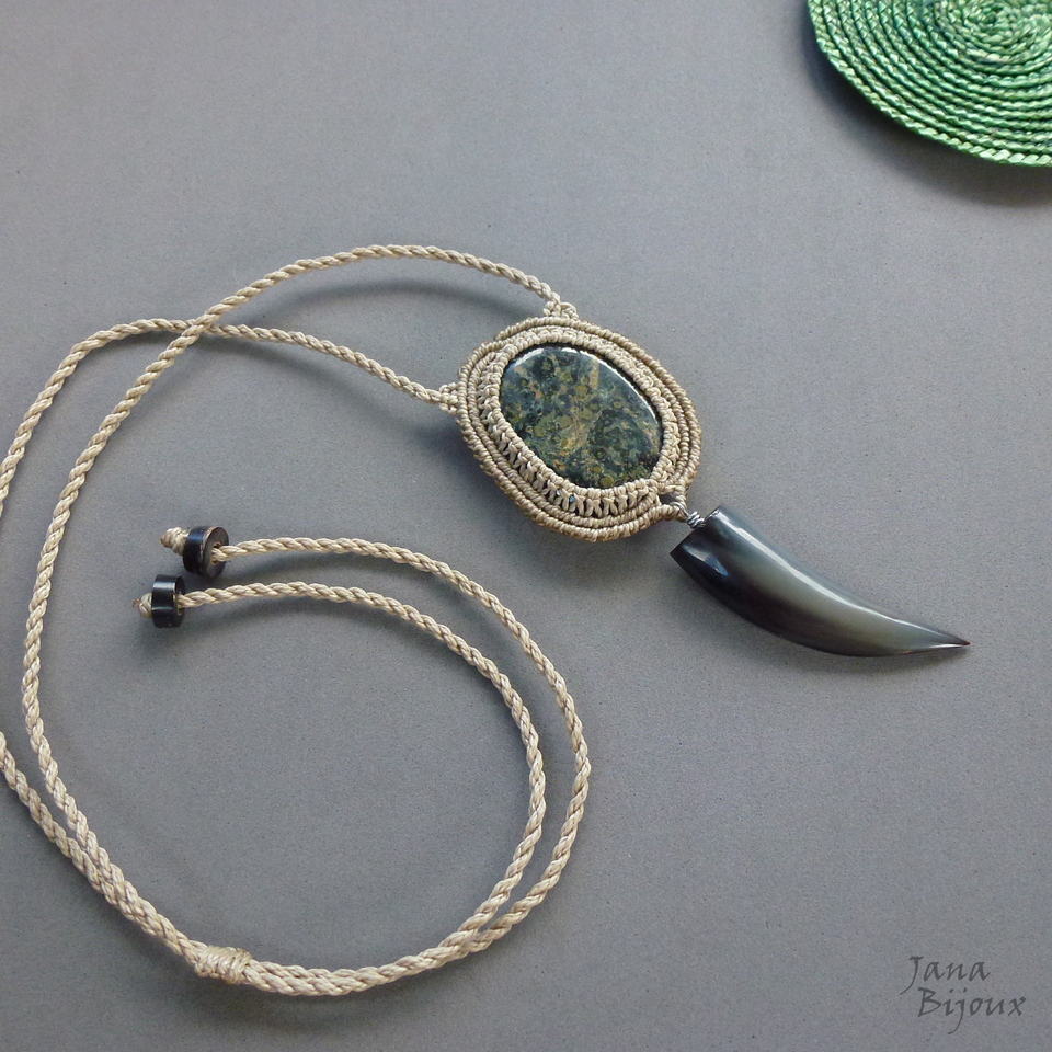 Jaspis kambaba se zubem z rohoviny a makramé.