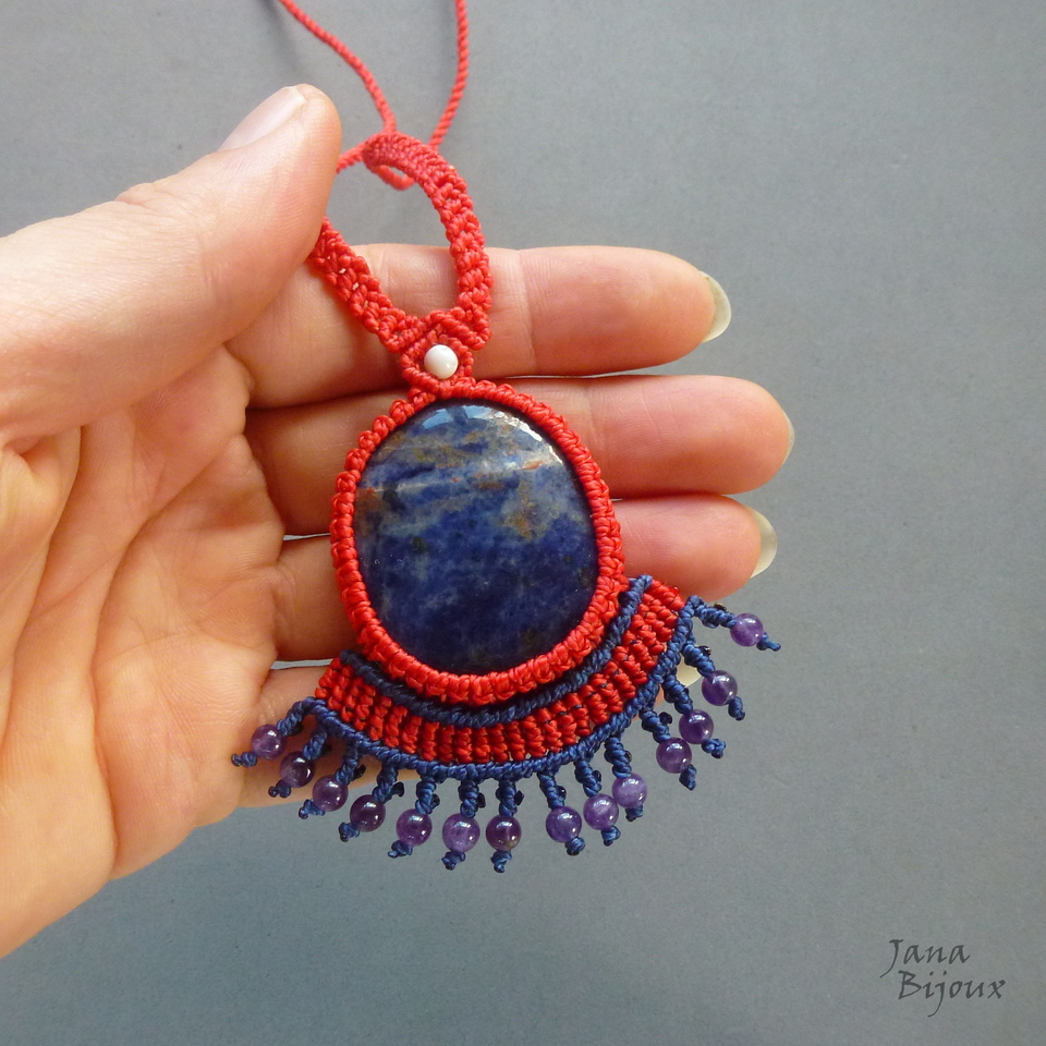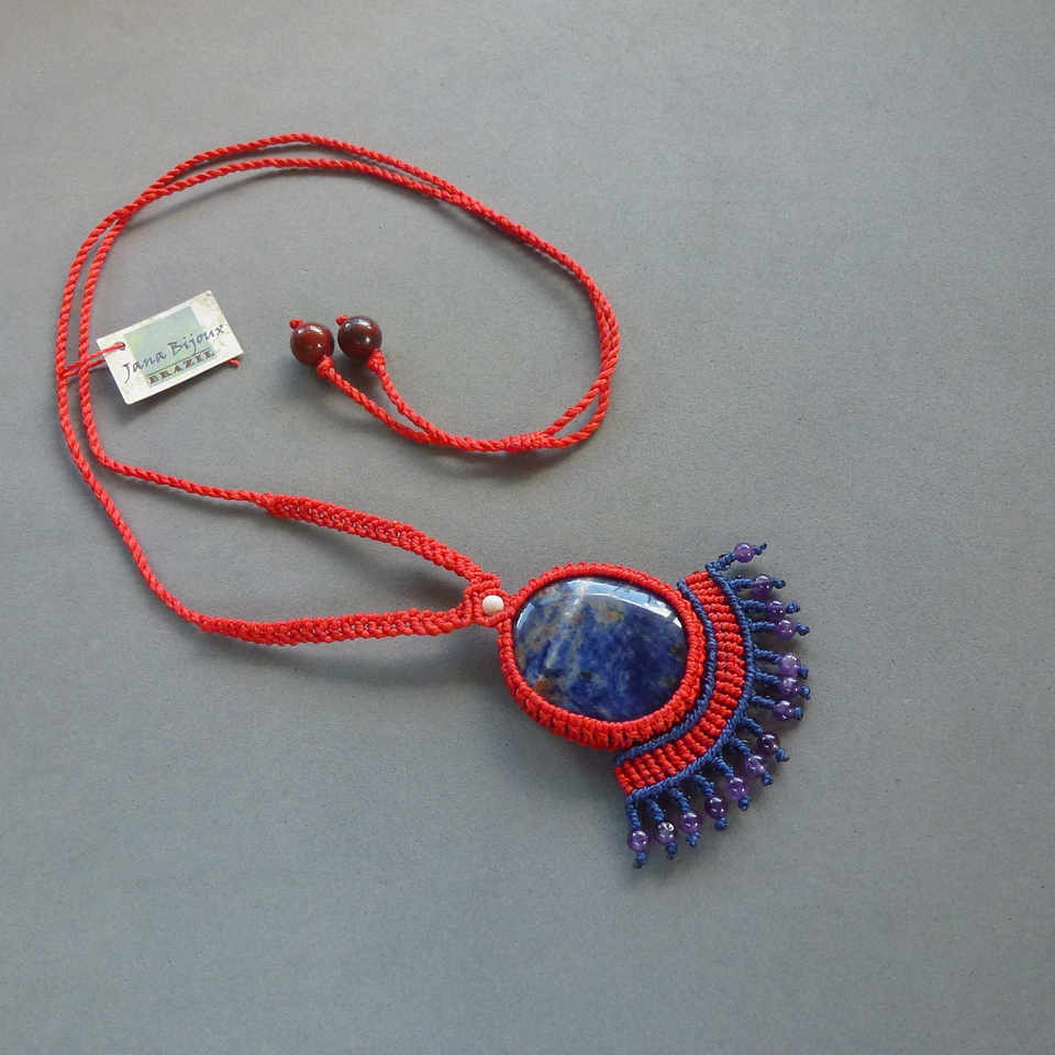 Sodalita num colar de macramé vermelho, com franja.