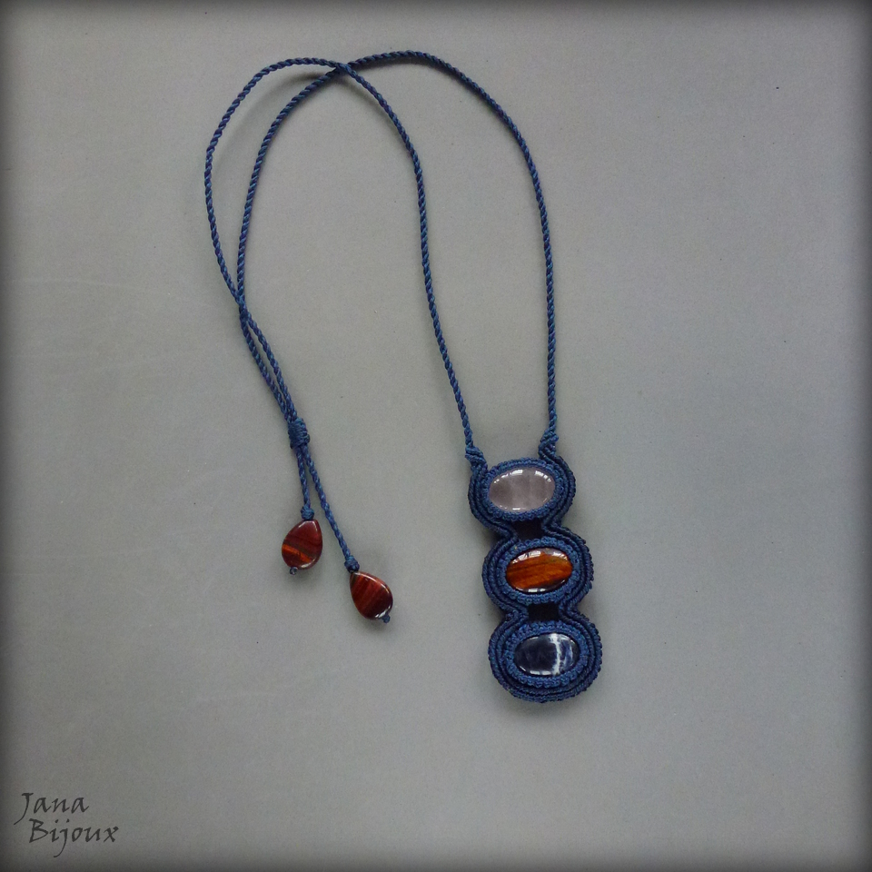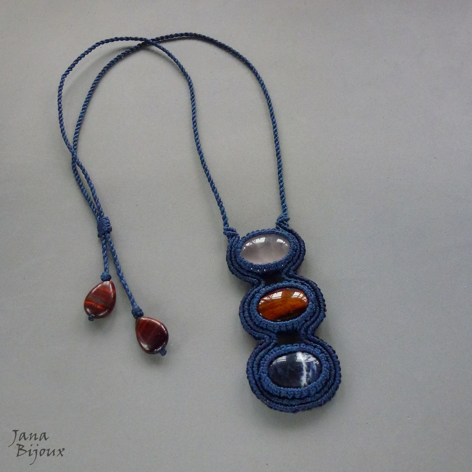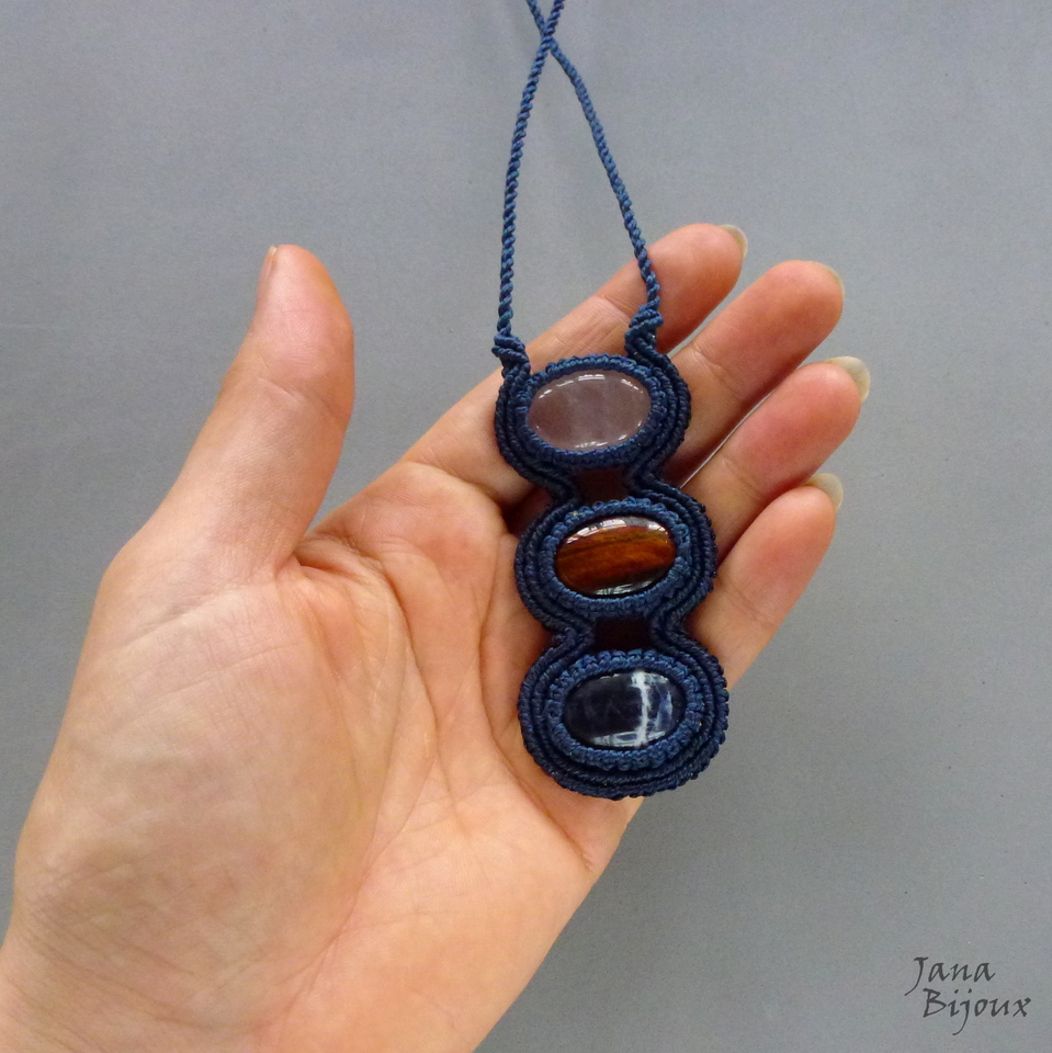 3 pedras naturais, de alta qualidade –  olho-de-boi, sodalita e quartzo rosa. As pedras seguram junto só com macramé, sem cola e sem furos e juntas medem 8 cm de altura e 3,5 cm de largura. Todas tem polimento cabochon (= pedra preciosa polida sem arestas, em formato circular. Plana de uma lado e arredondada de outro).