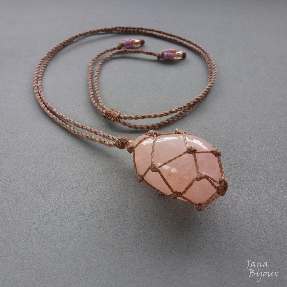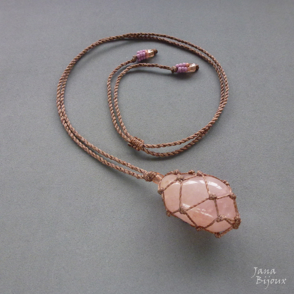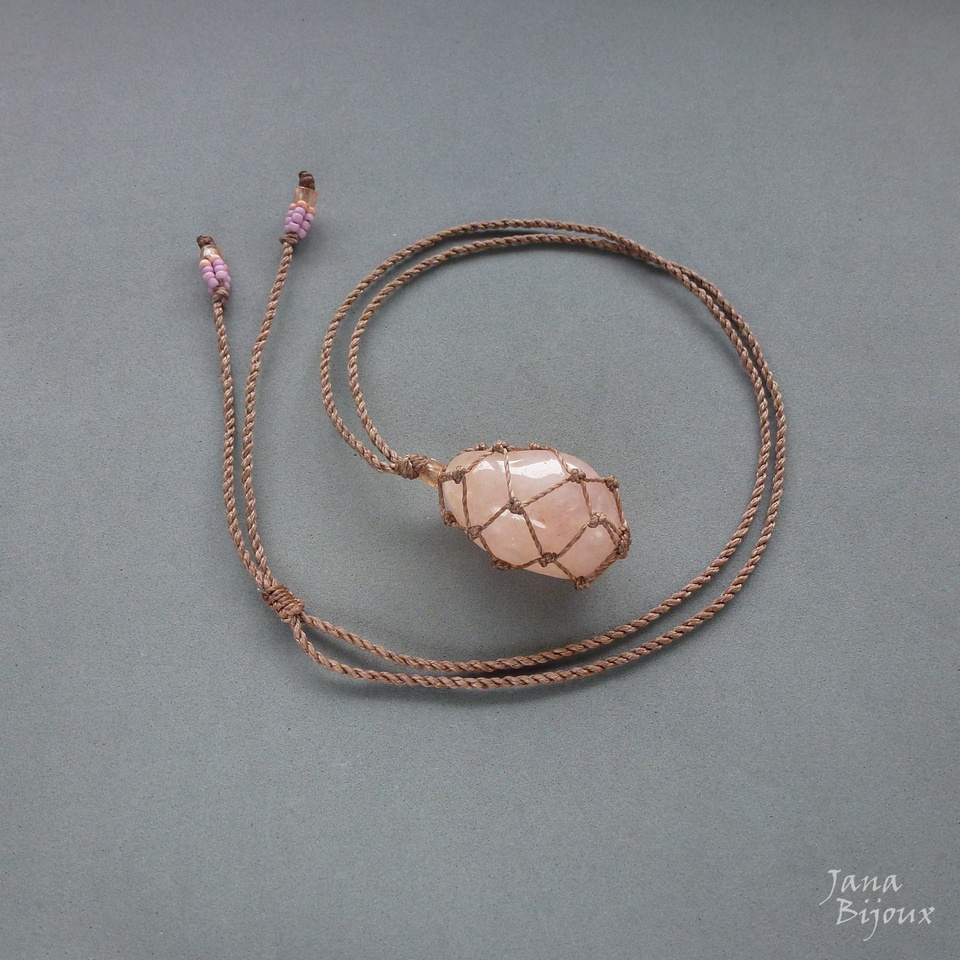 Colar com quartzo rosa castroado, comprimento ajustável, abre até 93 cm. Nas pontas vidro e miçangas.