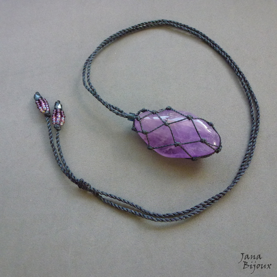 Colar com ametista extra grande, castroado, comprimento ajustável, abre até 94 cm. Nas pontas vidro e miçangas.