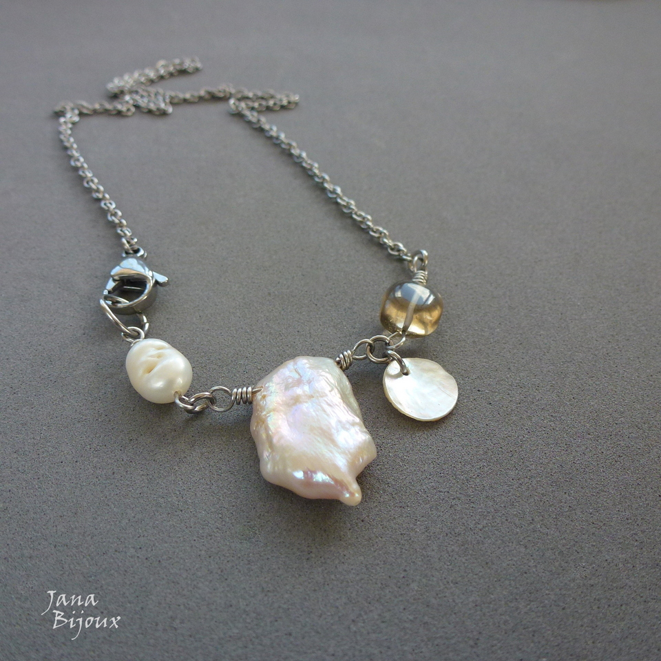 Colar curto 40,5 cm (possível fazer mais comprido), feito de inox, com pérola natural toda rústica, grande e com brilho furta-cor, mais uma pérola, concha e quartzo fumê, fecho na frente. Pra ser usado como gargantilha. R$ 29,90 SUPER PEÇA ÚNICA