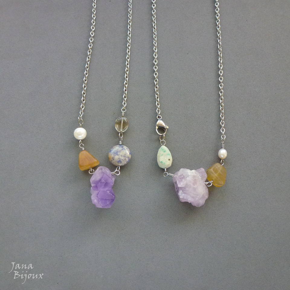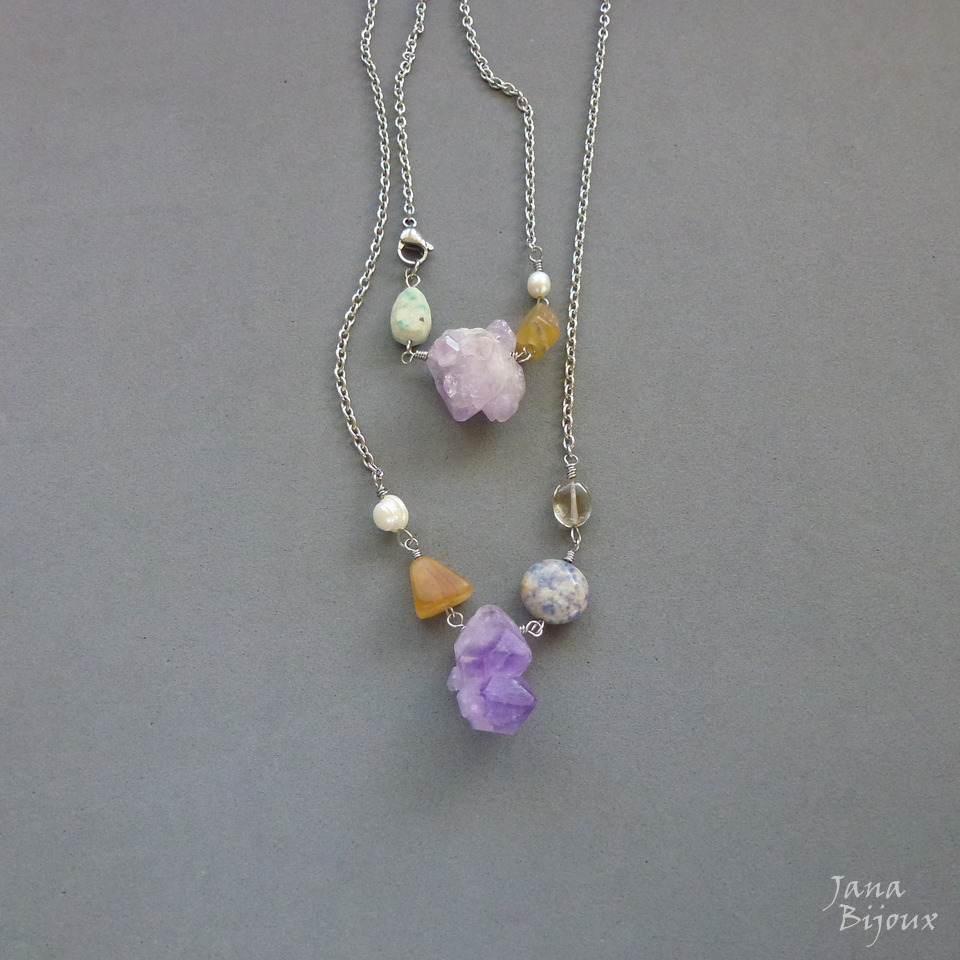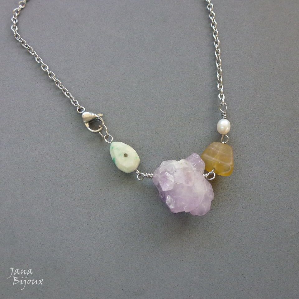 Colar médio 56,5 cm com pedras rústicas (ametista, fluorita, pérola) e aço inox, com fecho R$ 29,90