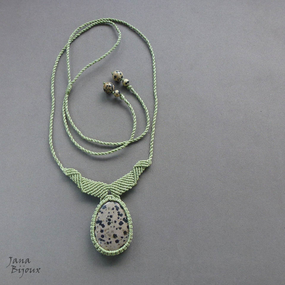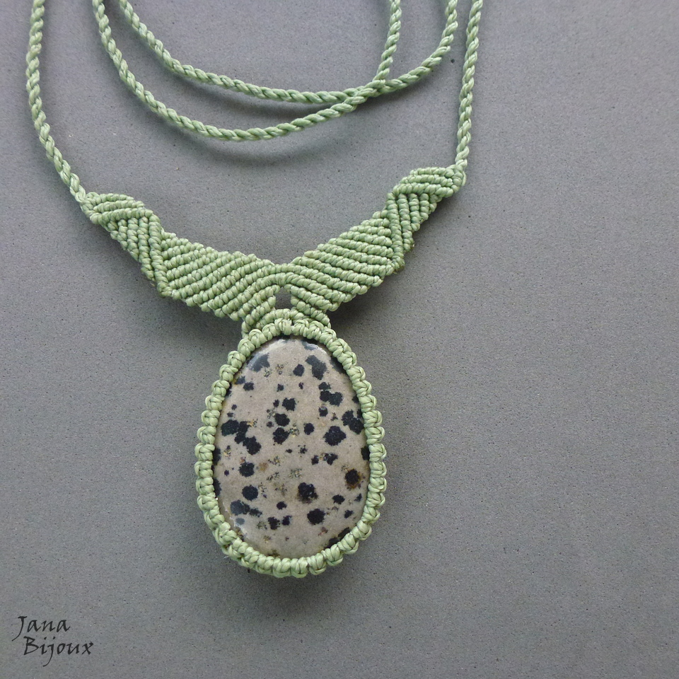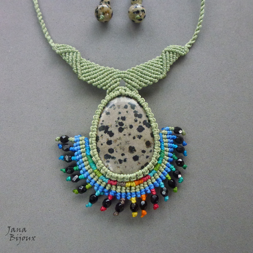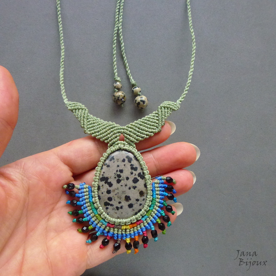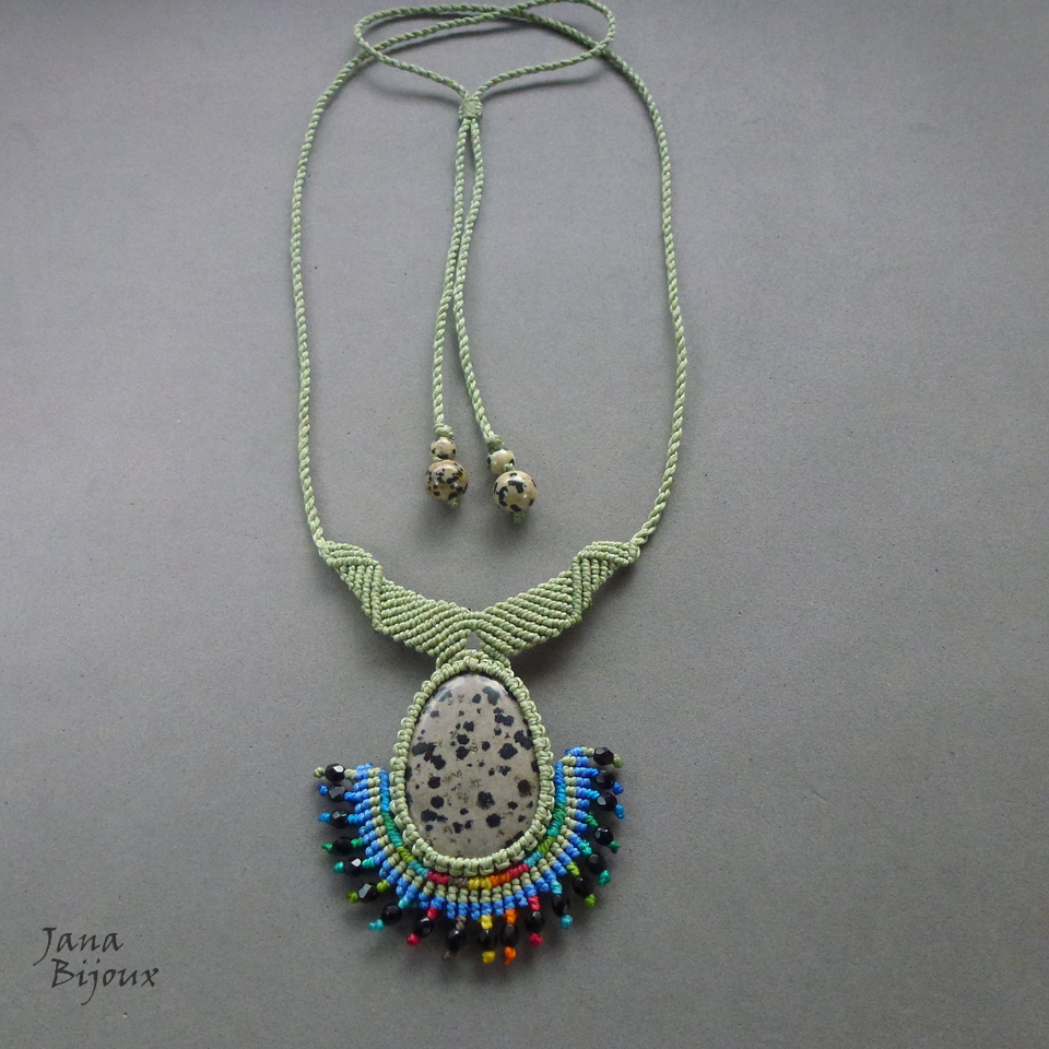 Colar originalmente sem franja, com jaspe dalmata feito de macramé.