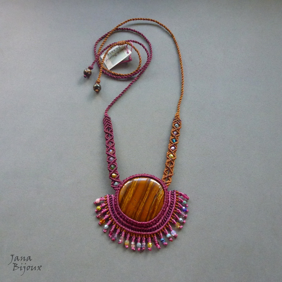 Colar assimétrico de macramé, franja, com olho de tigre africano.