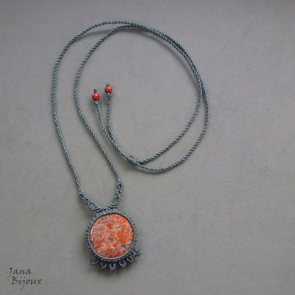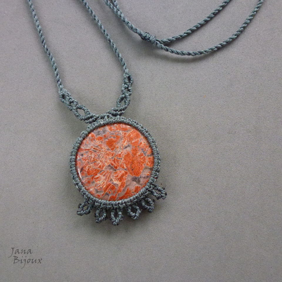 Jaspe num colar menor com macramé em fio de cor azul jeans.