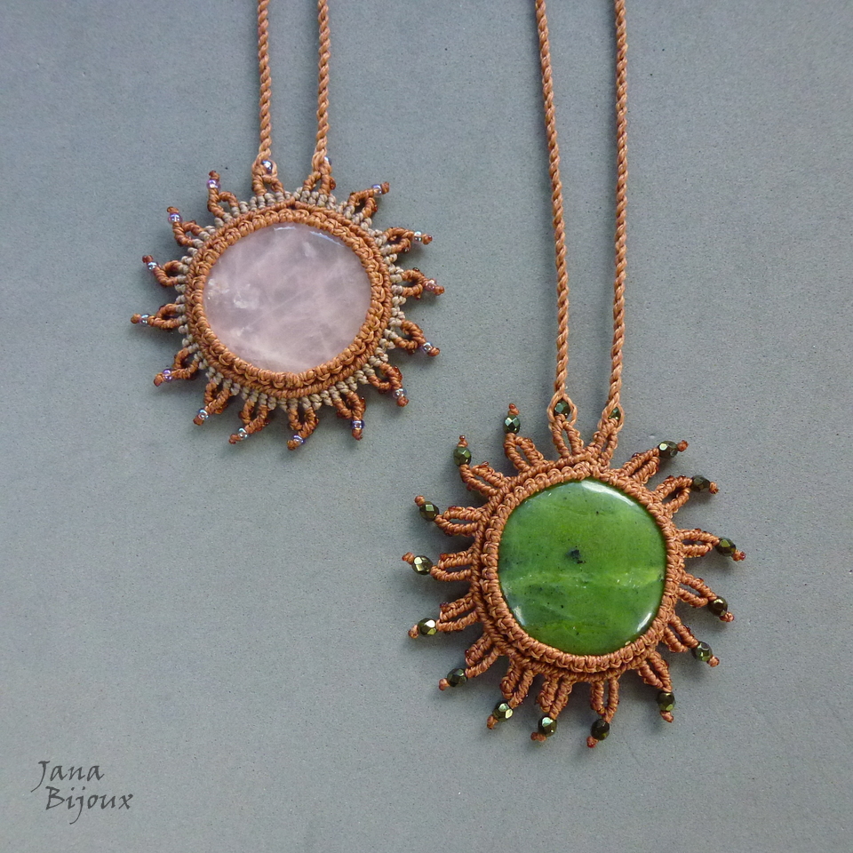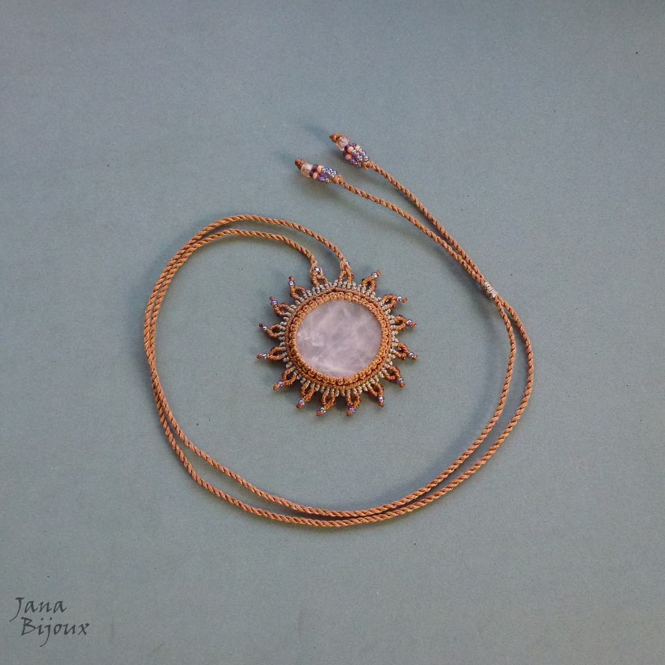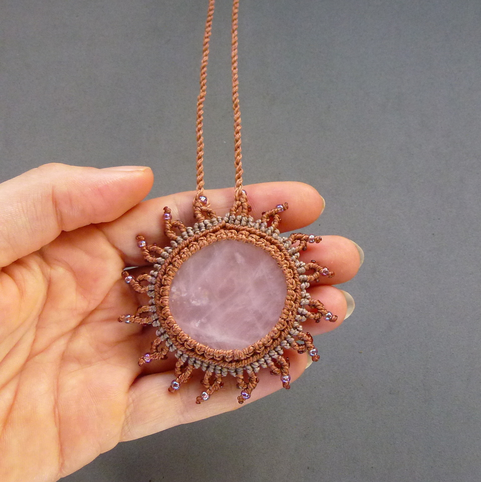 Pedra quartzo rosa brasileiro.. num colar de macramé em formato de sol + miçangas furta-cor.
