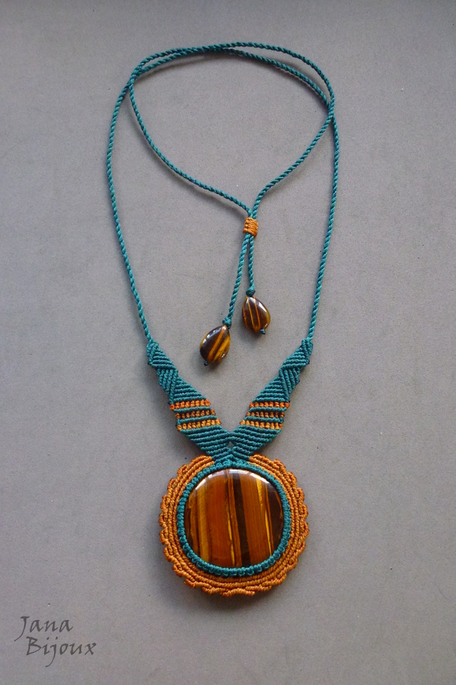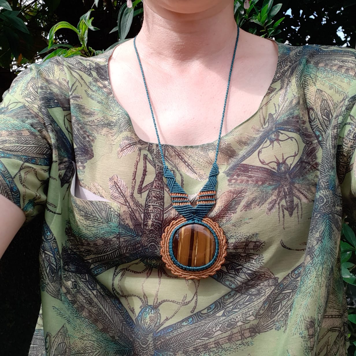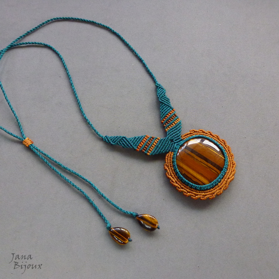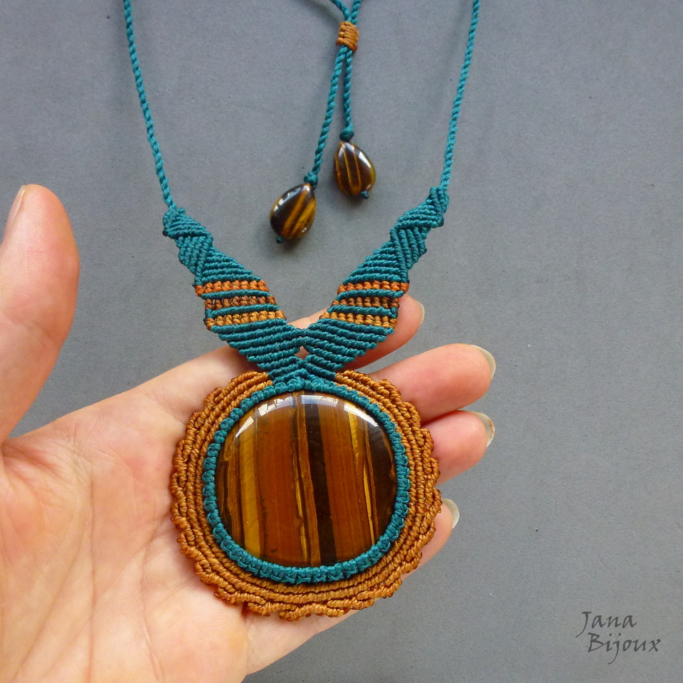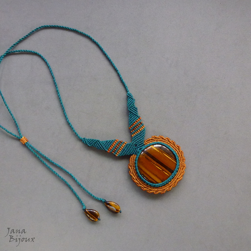 Pedra olho-de-tigre africano.. num colar exuberante de macramé .