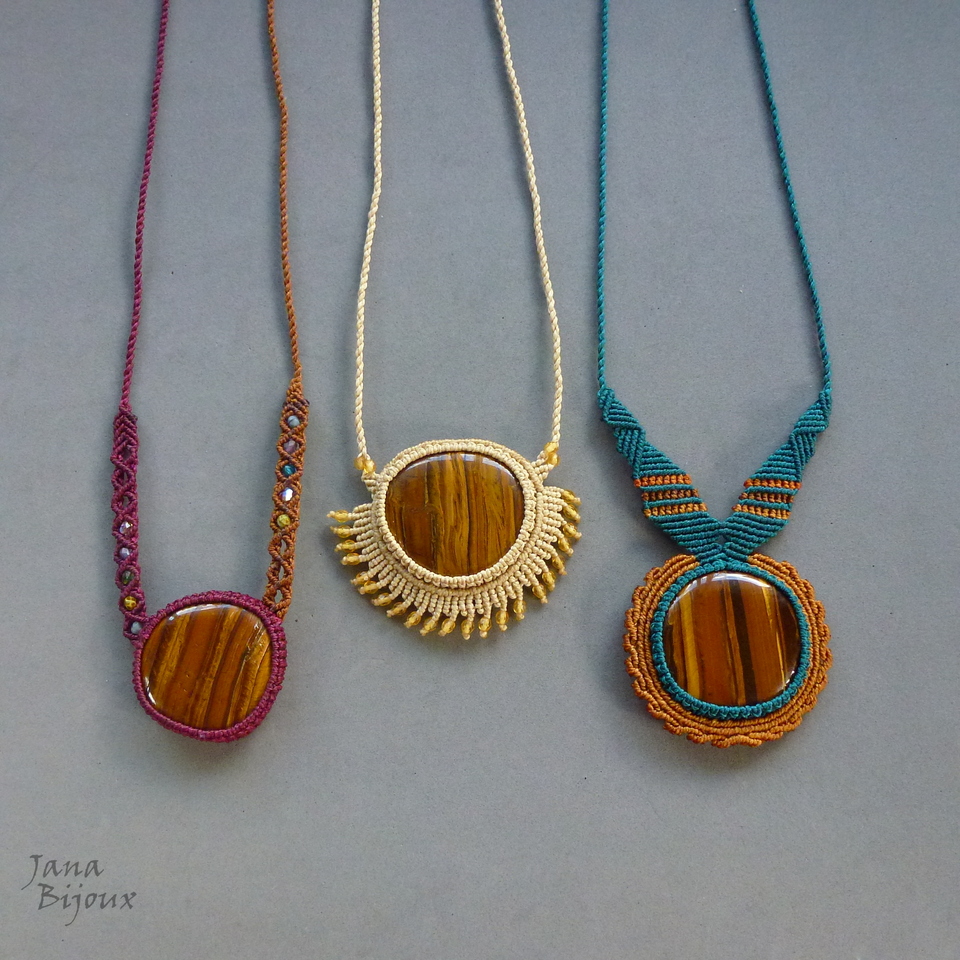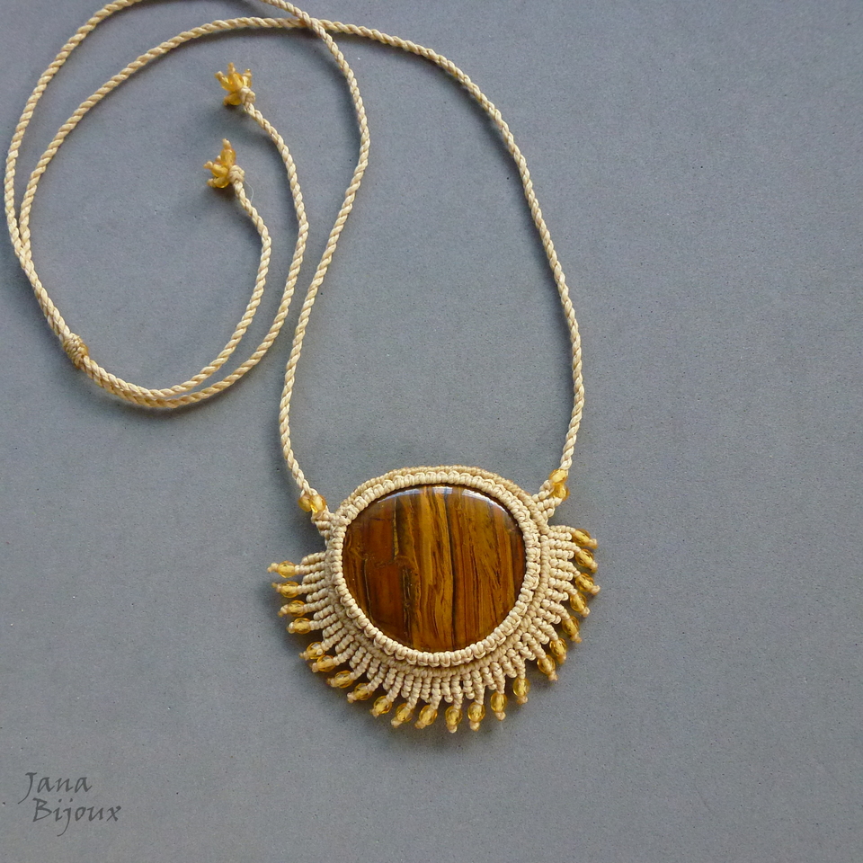 Pedra olho-de-tigre africano.. com franja,num colar exuberante de macramé .