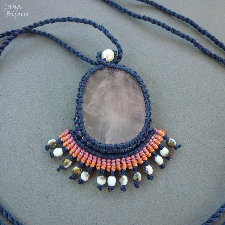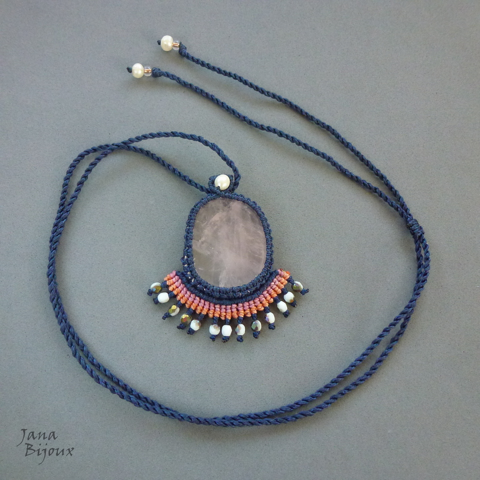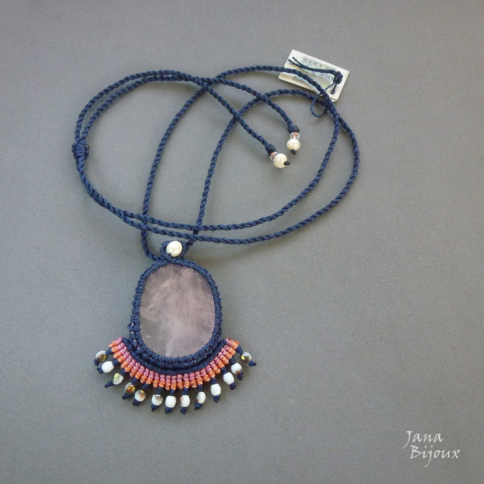 Colar de macramé com pedra quartzo rosa, pérolas, cristais e fio azul marinho escuro.