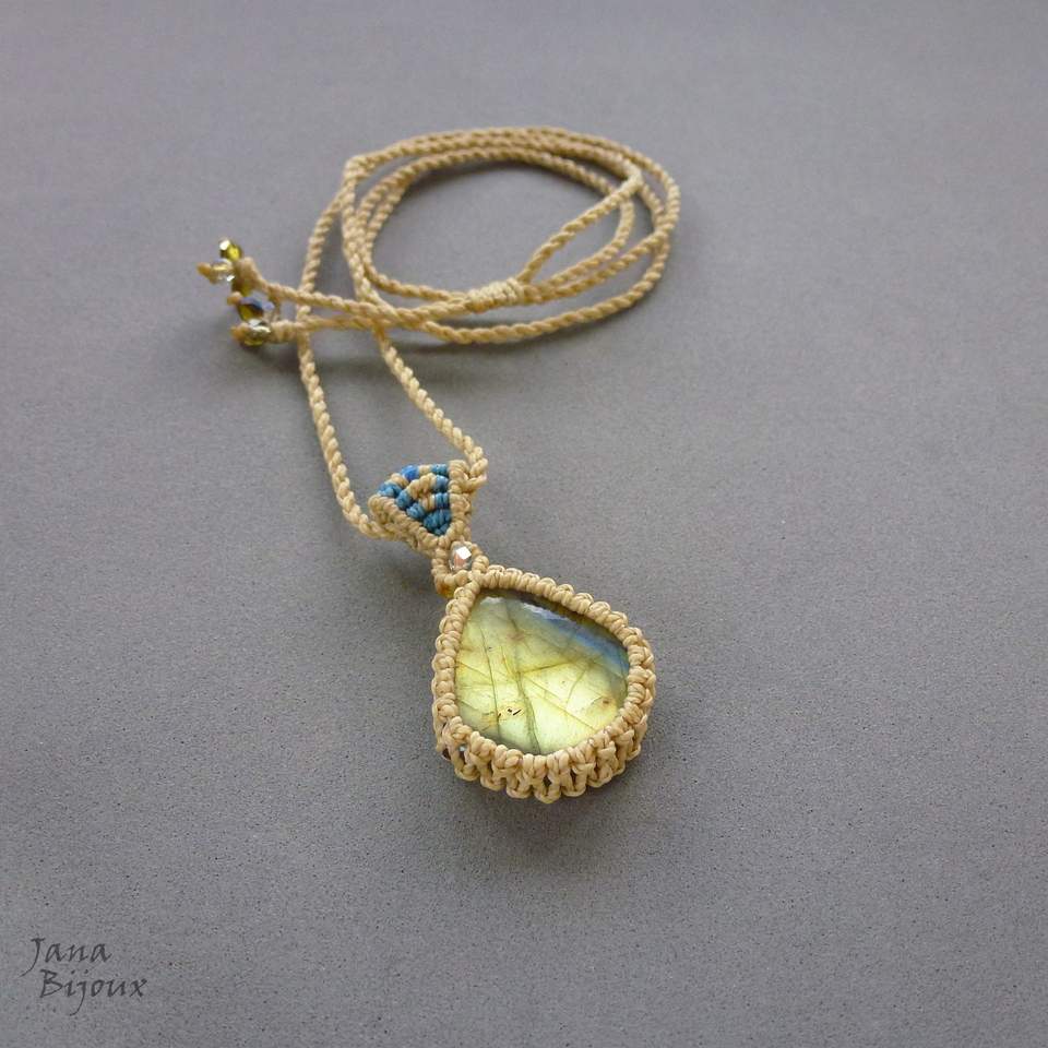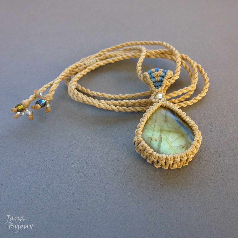 Pedra com a luz dourada, mede 2,9 cm x 2,6 cm e é de Madagascar. Numa das laterais a pedra tem uma ” veia” ou traço de azul forte, bem lindo. O pingente inteiro com alça e macramé ornamental em cores azuis (combinando com desenho da pedra) e em cor cru, tem 4,8 cm e tem movimento livre no cordão.