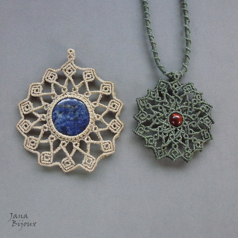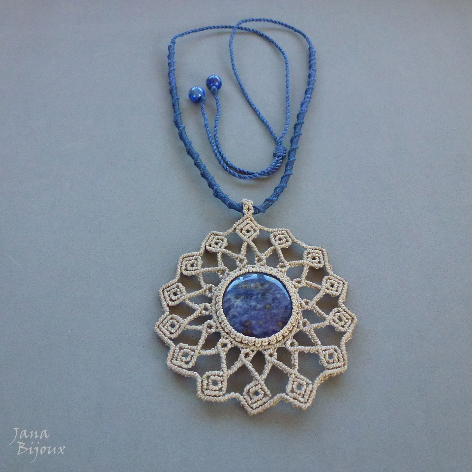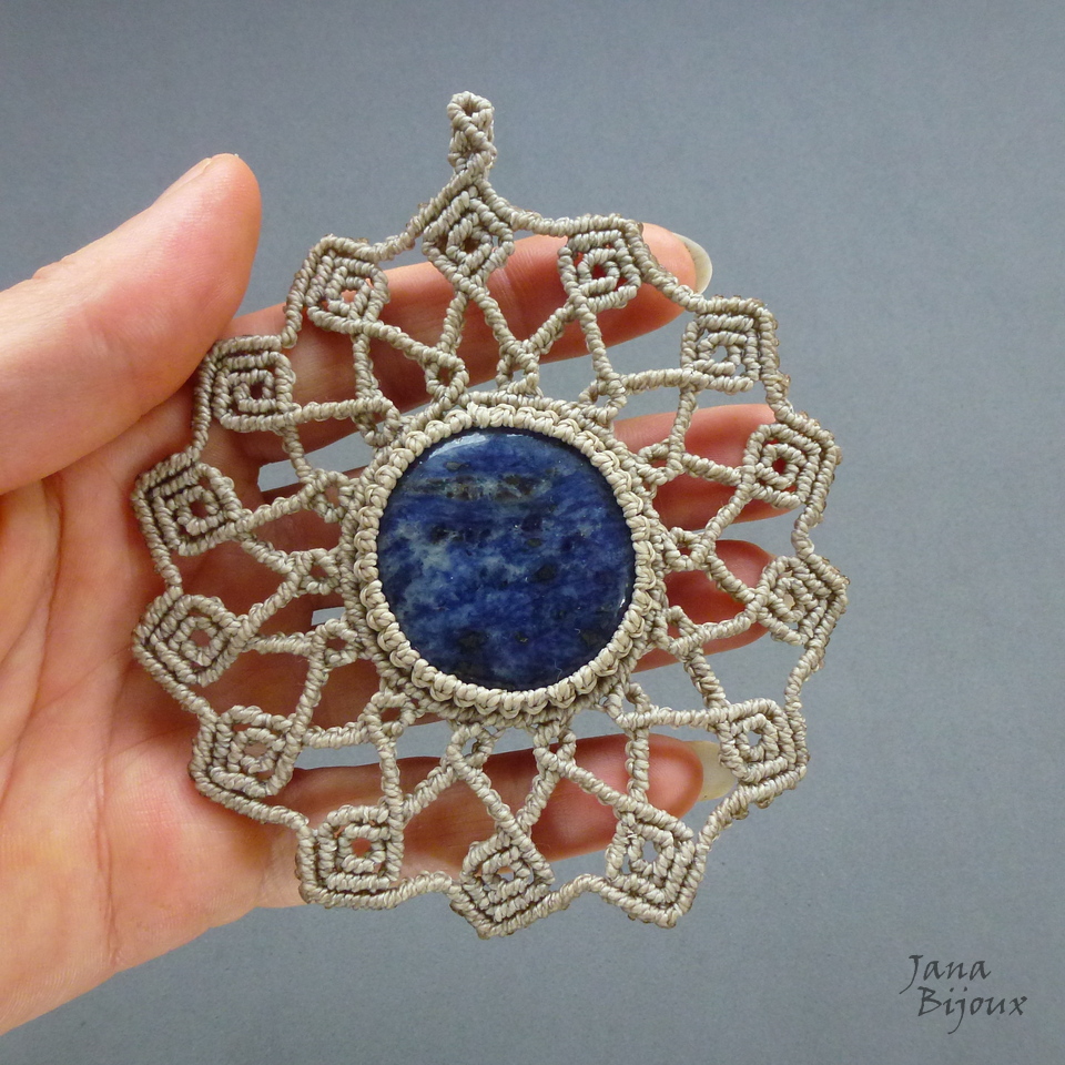 MANDALA, mede com alça 11 cm. A pedra central é sodalita que tem 4 cm. Pingente é super leve, levou muito tempo para ser confeccionado e quase 26 metros de fio. Na última foto com outra mandala que fiz daqui.