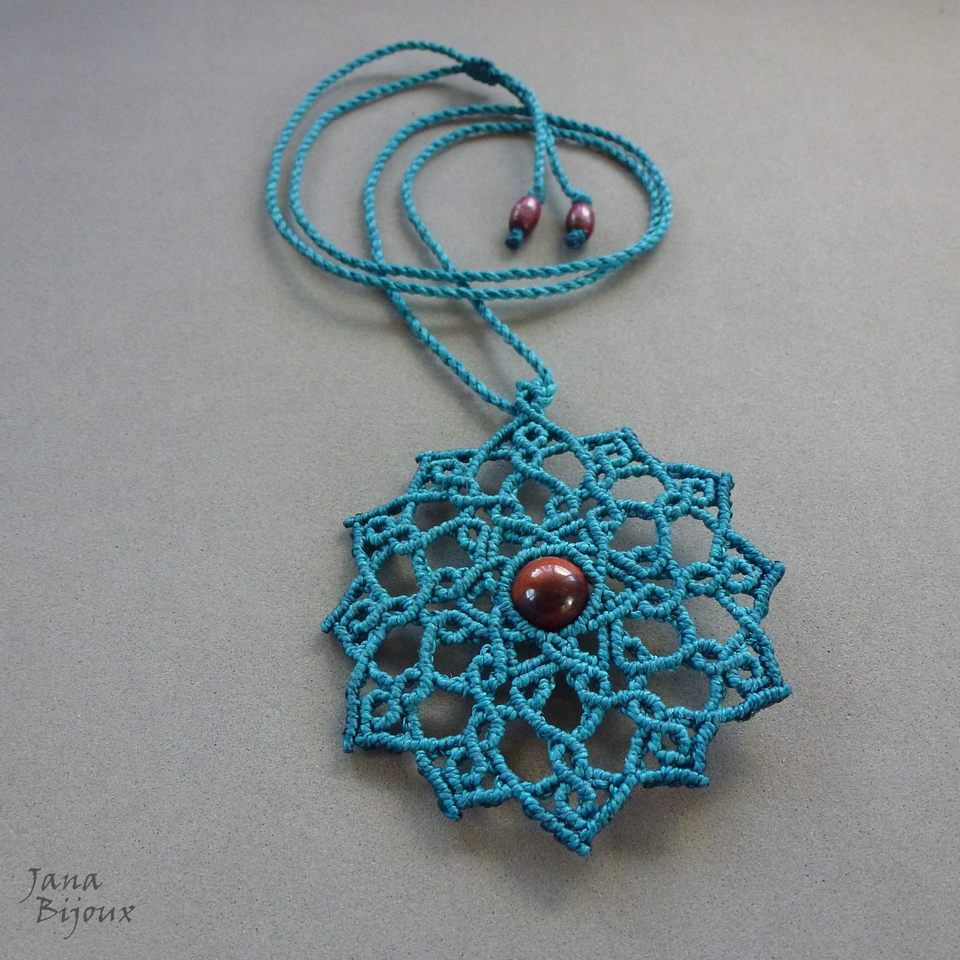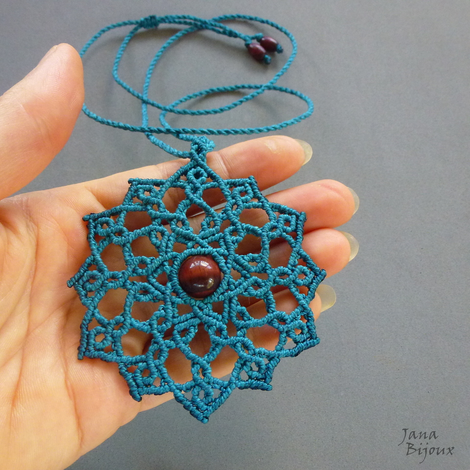 MANDALA,  mede 85 mm com alça. A esfera no meio de pedra natural  olho-de-boi e mede 1,4 cm . Pingente é super leve, levou muito tempo para ser confeccionado e muitos metros de fio.