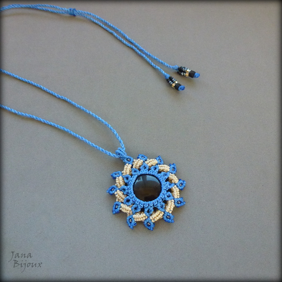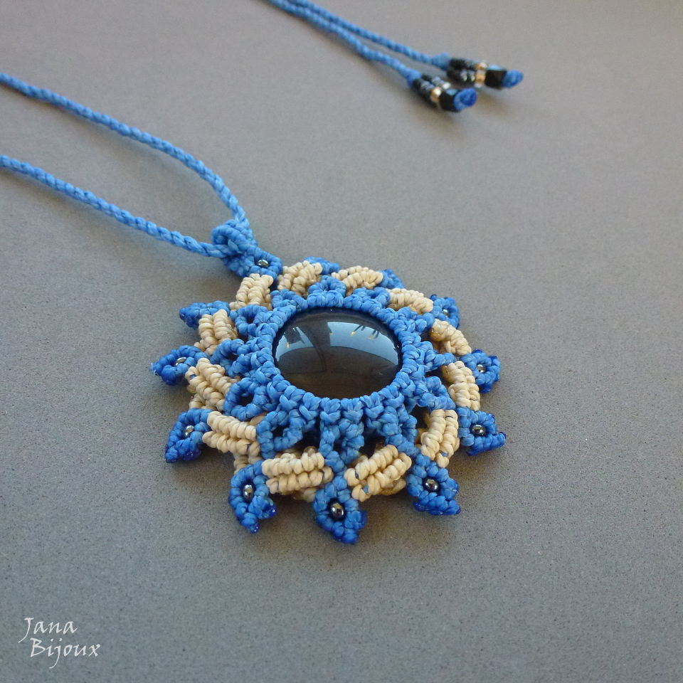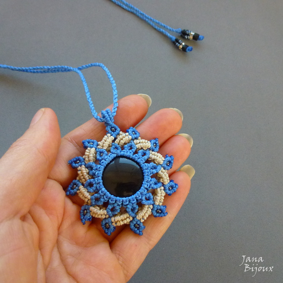 MANDALA, mede com alça 6,5 cm. A pedra central é ônix e tem 2,5 cm. Pingente é super leve, levou muito tempo para ser confeccionado e muitos metros de fio.