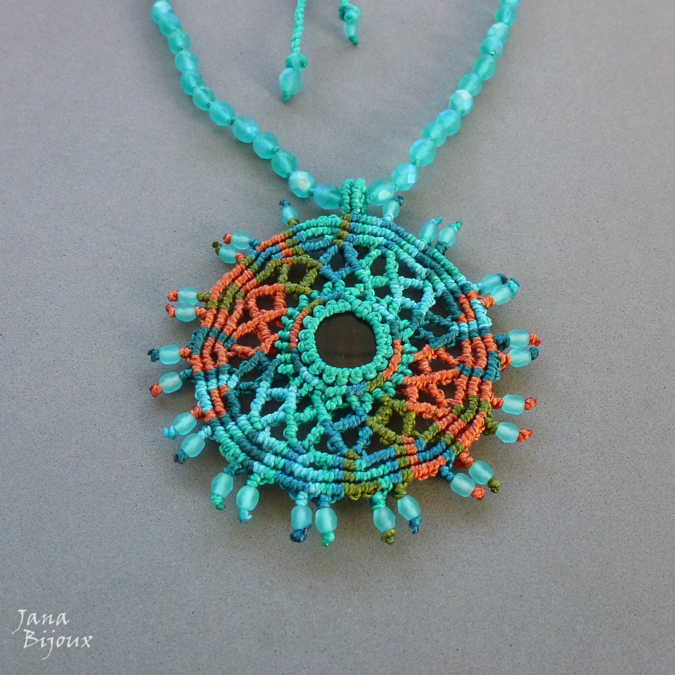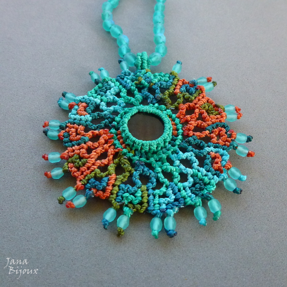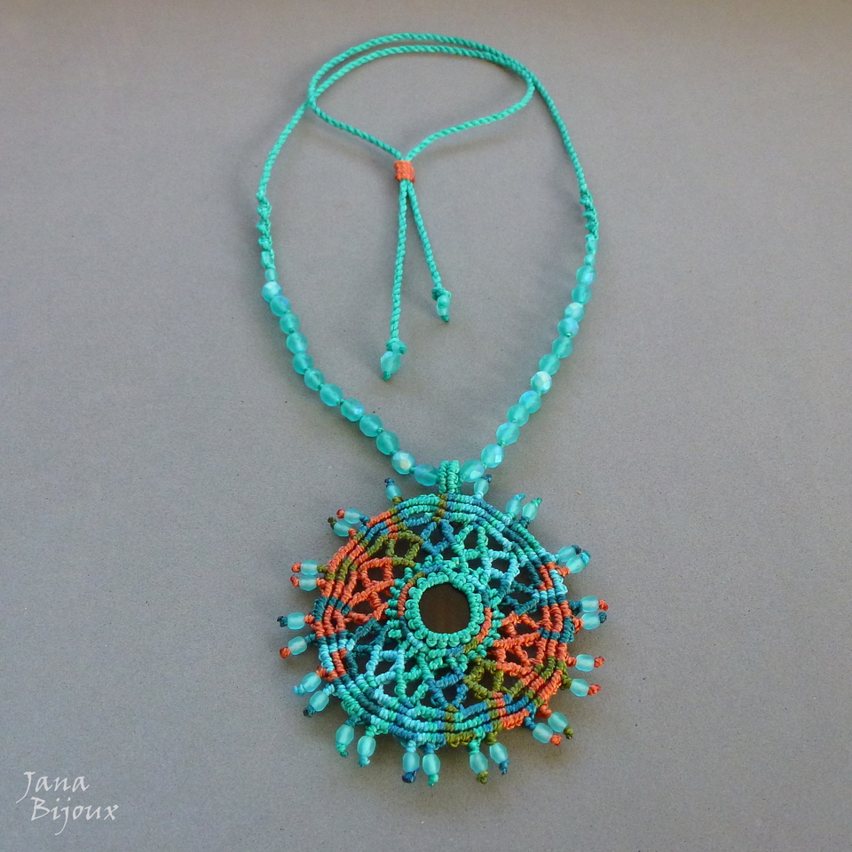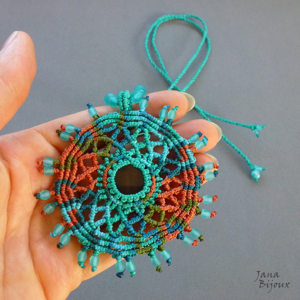 MANDALA, mede 8 cm com a alça. A peça do meio é ágata, pedra natural e mede 2 cm . Pingente é super leve, levou muito tempo para ser confeccionado e muitos metros de fio. Na última foto pingente do avesso.