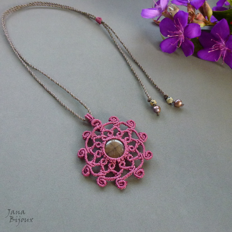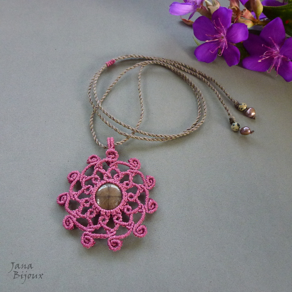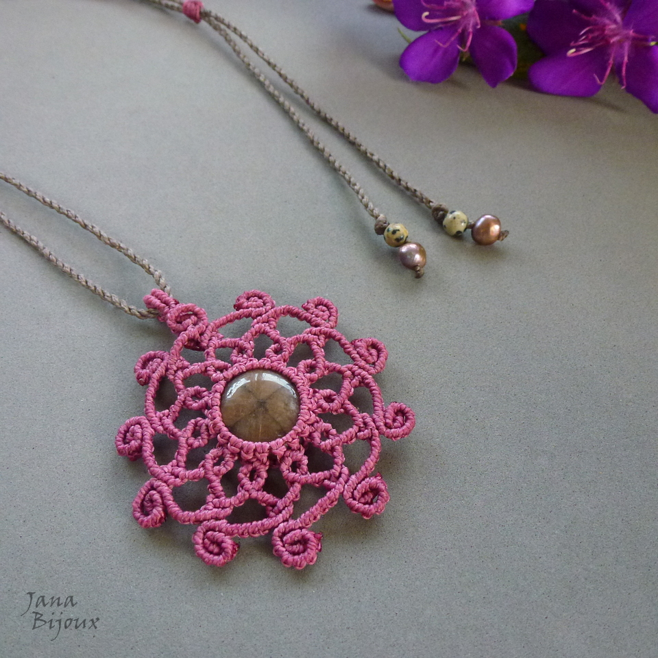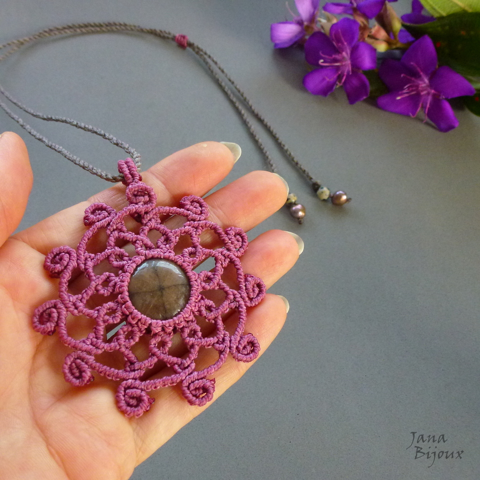 Fios de cor: a mandala é feita de cor uva e cordão fiz de linda cor acinzentada difícil de definir meio marrom, meio lilás e bem neutra que casa perfeitamente com tom da pedra.