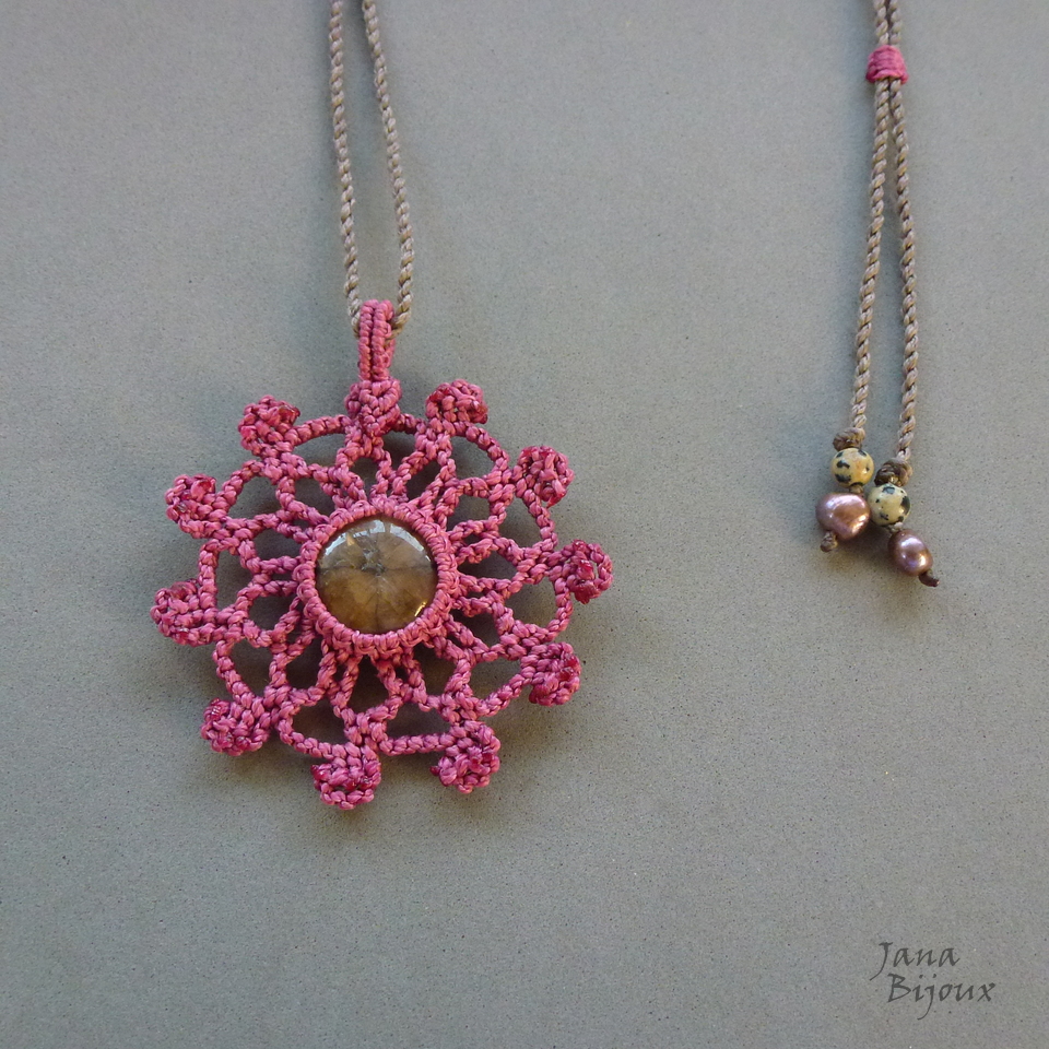 MANDALA, mede com alça 7 cm. Chiastolite mede 2,2 cm. Pingente é super leve, levou muito tempo para ser confeccionado e muitos metros de fio. Penúltima foto pingente do avesso. Na última foto junto com outra mandala com mesmo tipo de pedra, porém com menos macramé e outra cor de fio.