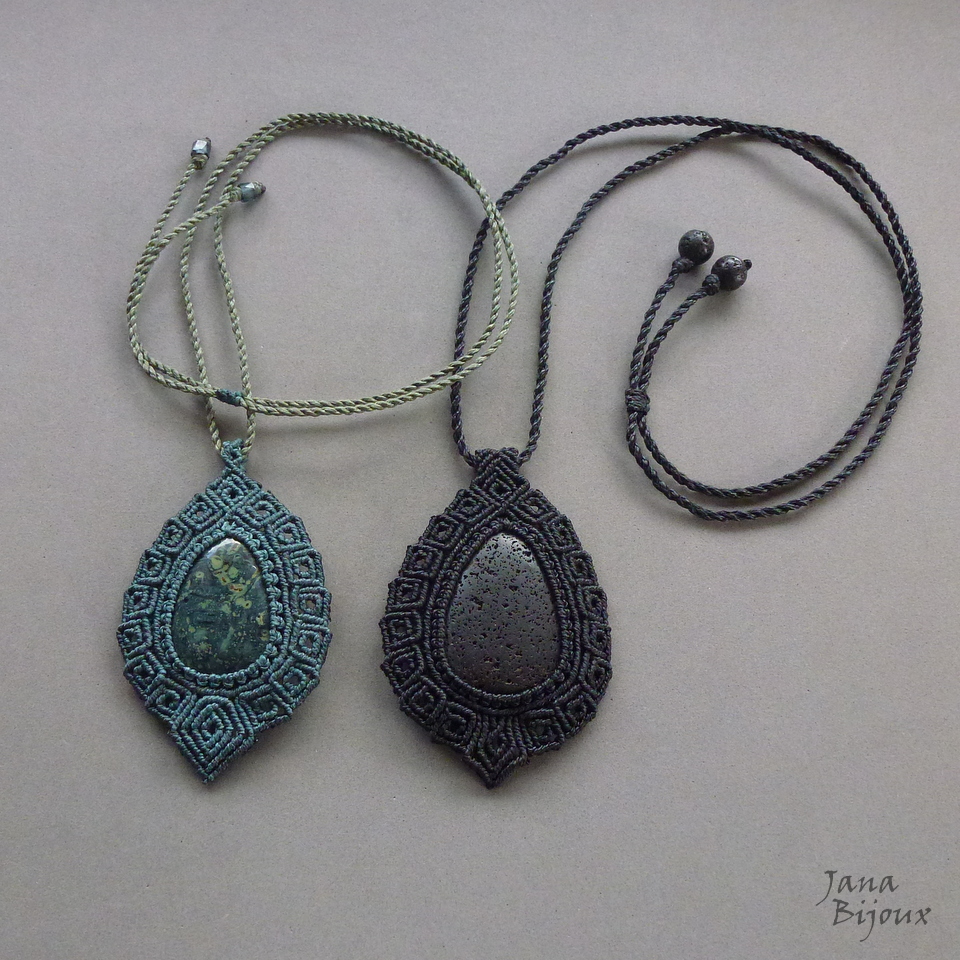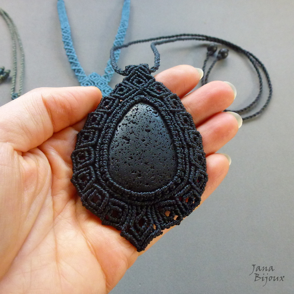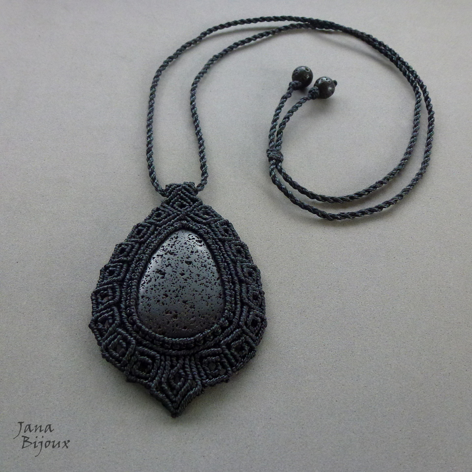 Pedra de vulcão num colar de macramé, com ponto quadrado, unissex.