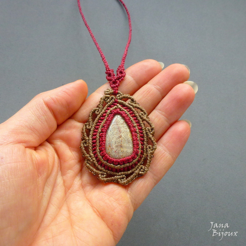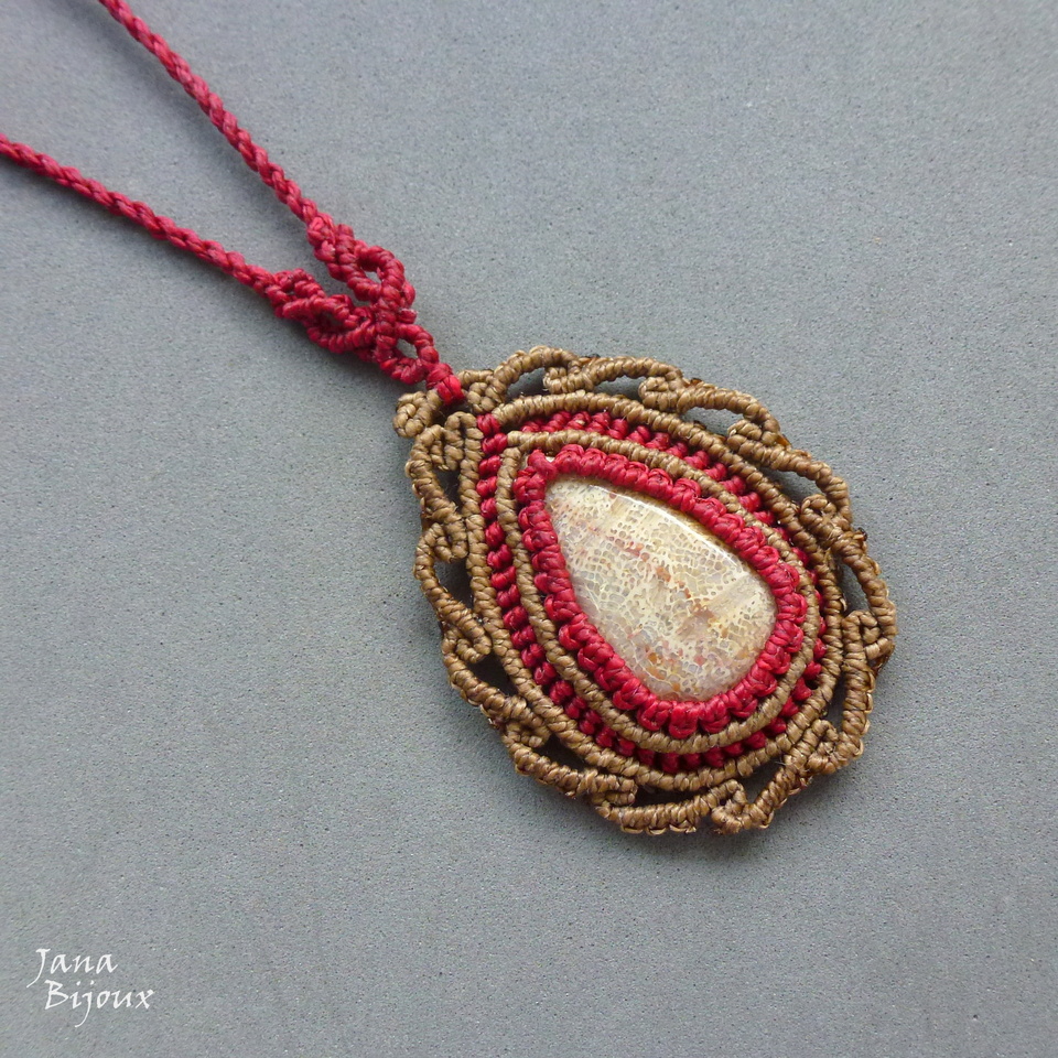 Um colar delicado com linda gota de coral fossilizado.