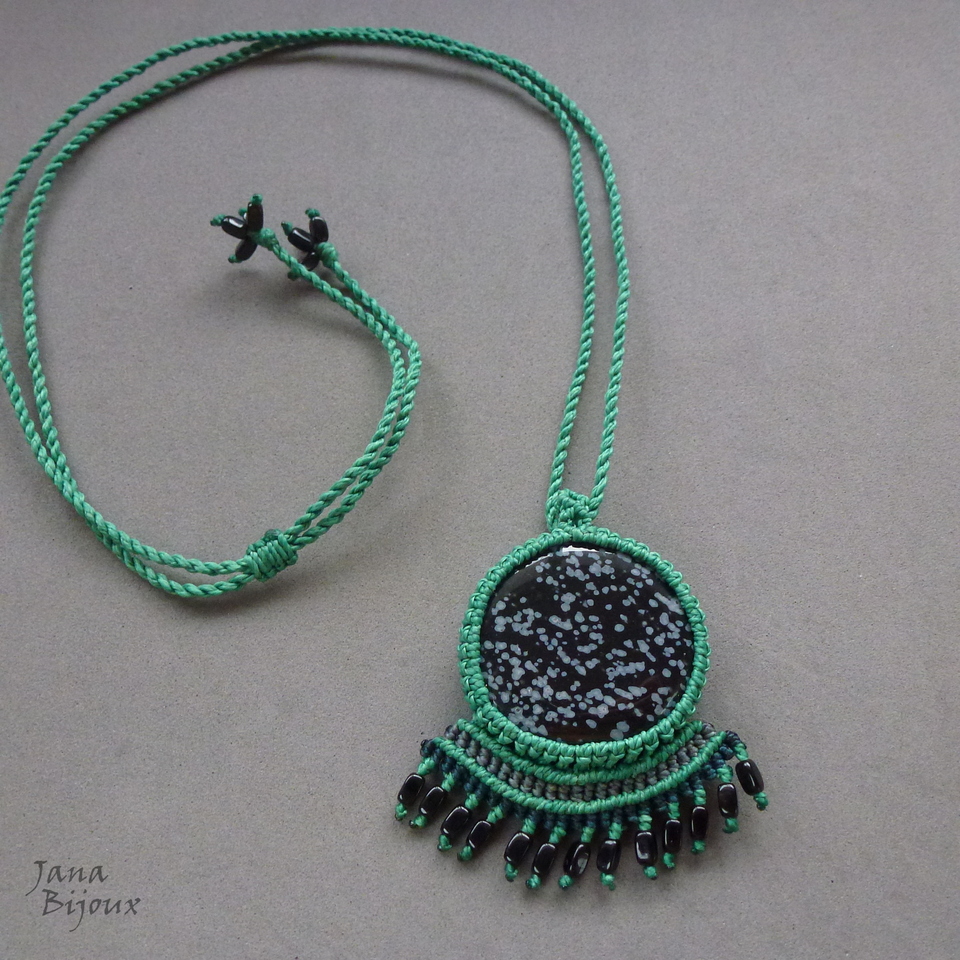 Colar de macramé com pedra obsidiana “flocos de neve” importada.