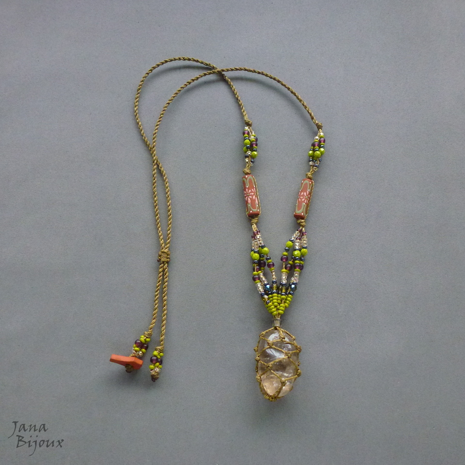 O colar com pedra castroada, miçangas e comprimento ajustável.
