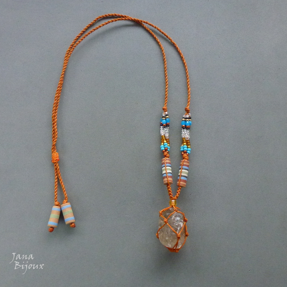 O colar com pedra castroada, miçangas e comprimento ajustável.