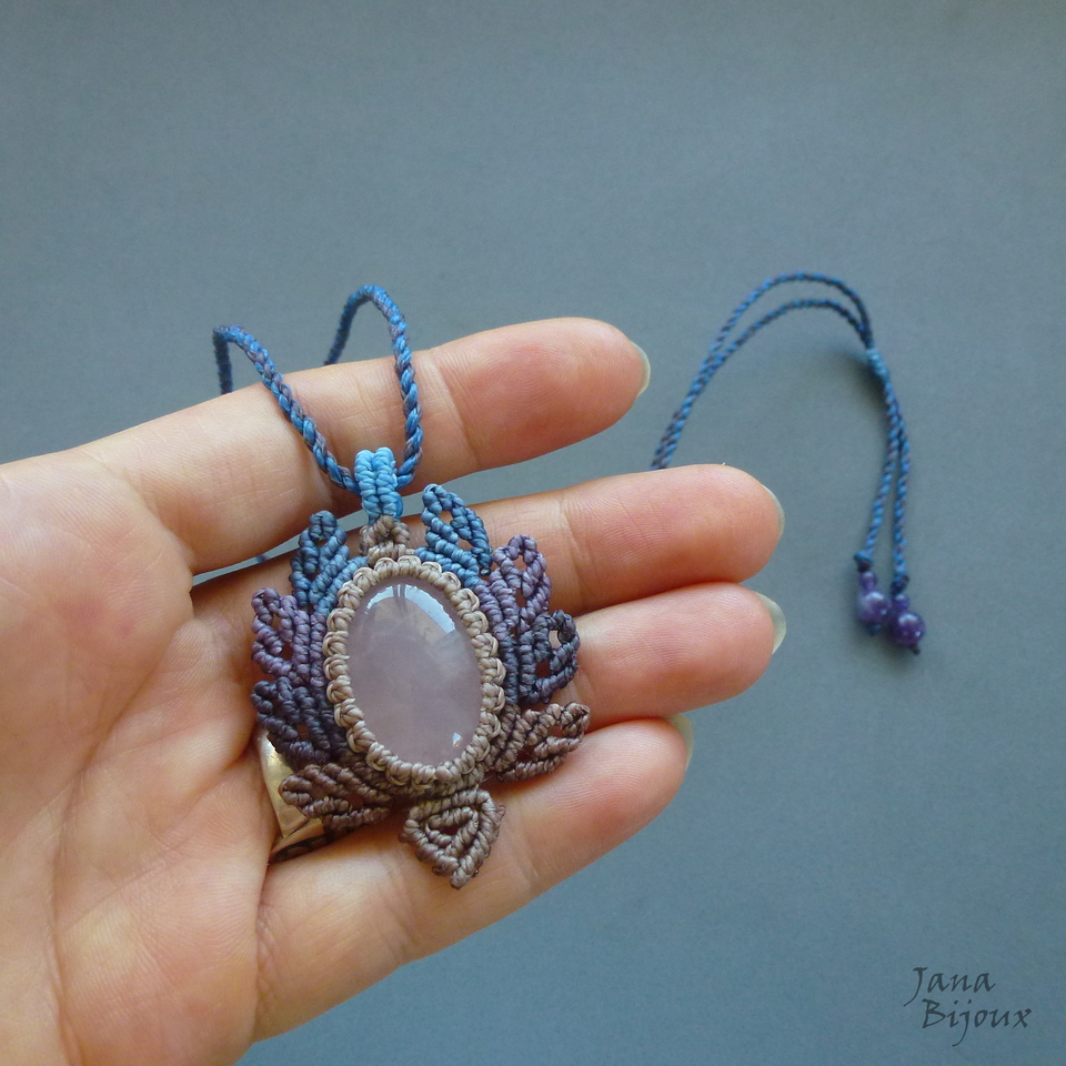 Pedra - tem polimento cabochão (= pedra preciosa polida sem arestas, em formato circular. Plana de uma lado e arredondada de outro). Mede 2,7 cm por 2,2 cm, o pingente inteiro com a alça e macrame tem 5,3 cm por 4 cm .