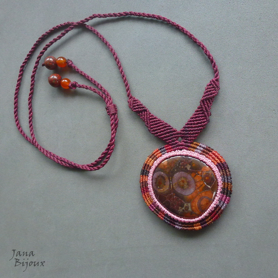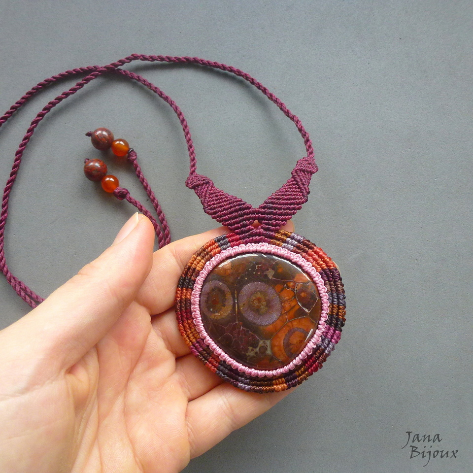 Pedra central mede 4,7 cm. Com o macramé, ela tem 62 mm. A pedra segura só com nós, sem cola e sem furo. A pedra se chama rhyolite, ” olho-de-pássaro ” , é importada, australiana , e tem coloração não típica em tons lilás, púrpura, laranja.. bem única.