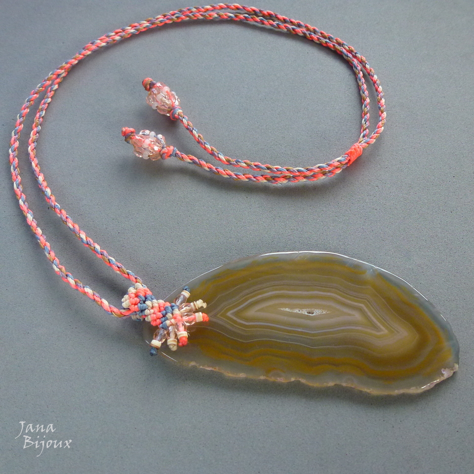 Neon coral num colar de macramé.