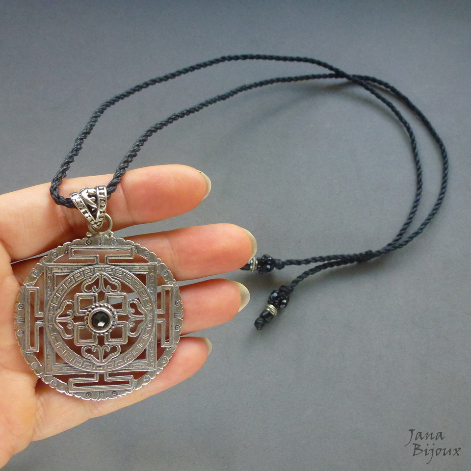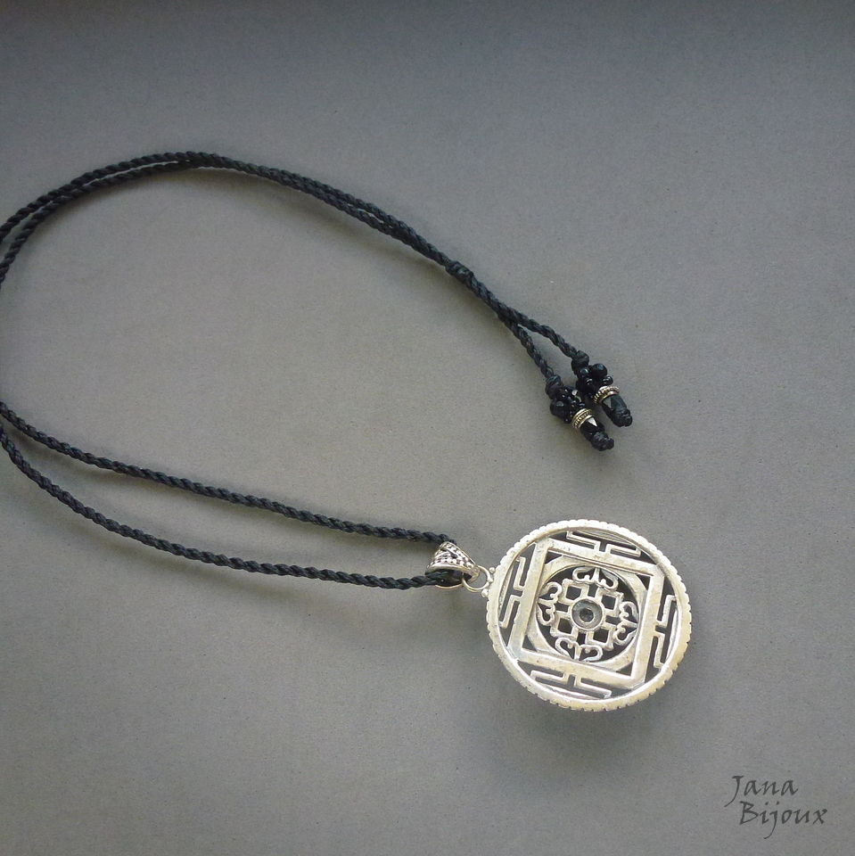 p990 11/03/2021VENDIDOS ( Prodáno)Jana Bijoux Pingente comprado no brechó, étnico , mede 5 cm por 6,5 cm, tem pouco uso, esta em bom estado. Cordão feito por mim, ajustável, abre até 82 cm, cor preta, vidro nas pontas. R$ 35,00