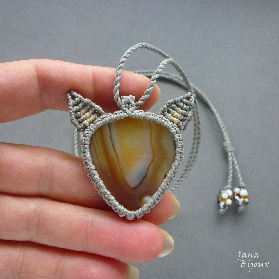 Colar de macramé, com pingente de pedra brasileira ágata de 3,8 cm, estilizado em formato de cabeça de gato.
